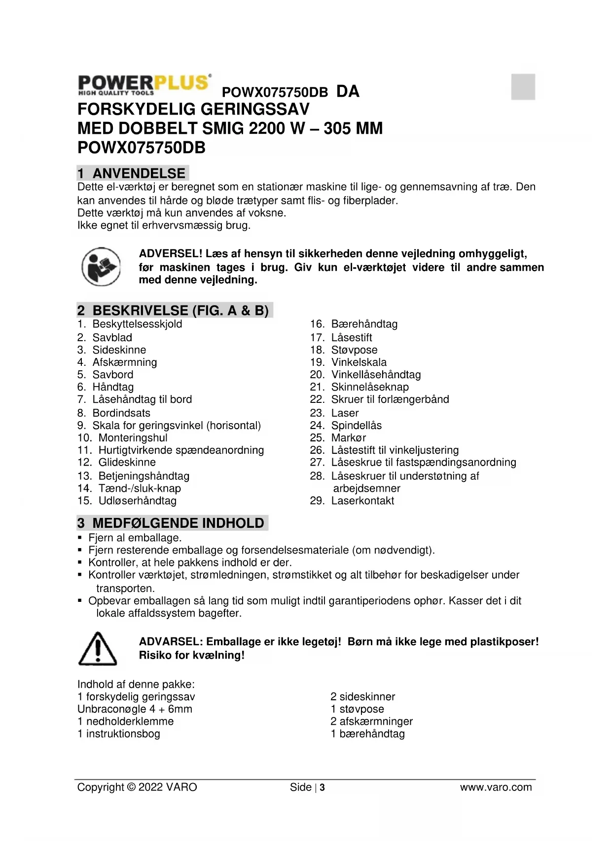 - Opbevar emballagen så lang tid som muligt indtil garantiperiodens ophør. Kasser det i dit lokale affaldssystem bagefter. ADVARSEL: Emballage er ikke legetøj! Børn må ikke lege med plastikposer! Risiko for kvælning! Indhold af denne pakke: 1 forskydelig geringssav Unbraconøgle 4 + 6mm 1 nedholderklemme 1 instruktionsbog 2 sideskinner 1 støvpose 2 afskærmninger 1 bærehåndtagPOWX075750DB DA Copyright © 2022 VARO Side | 4 www.varo.com Kontakt venligst forhandleren, når der mangler dele, eller de er beskadigede. 4 SYMBOLER I denne brugervejledning og/eller på maskinen anvendes der følgende piktogrammer: