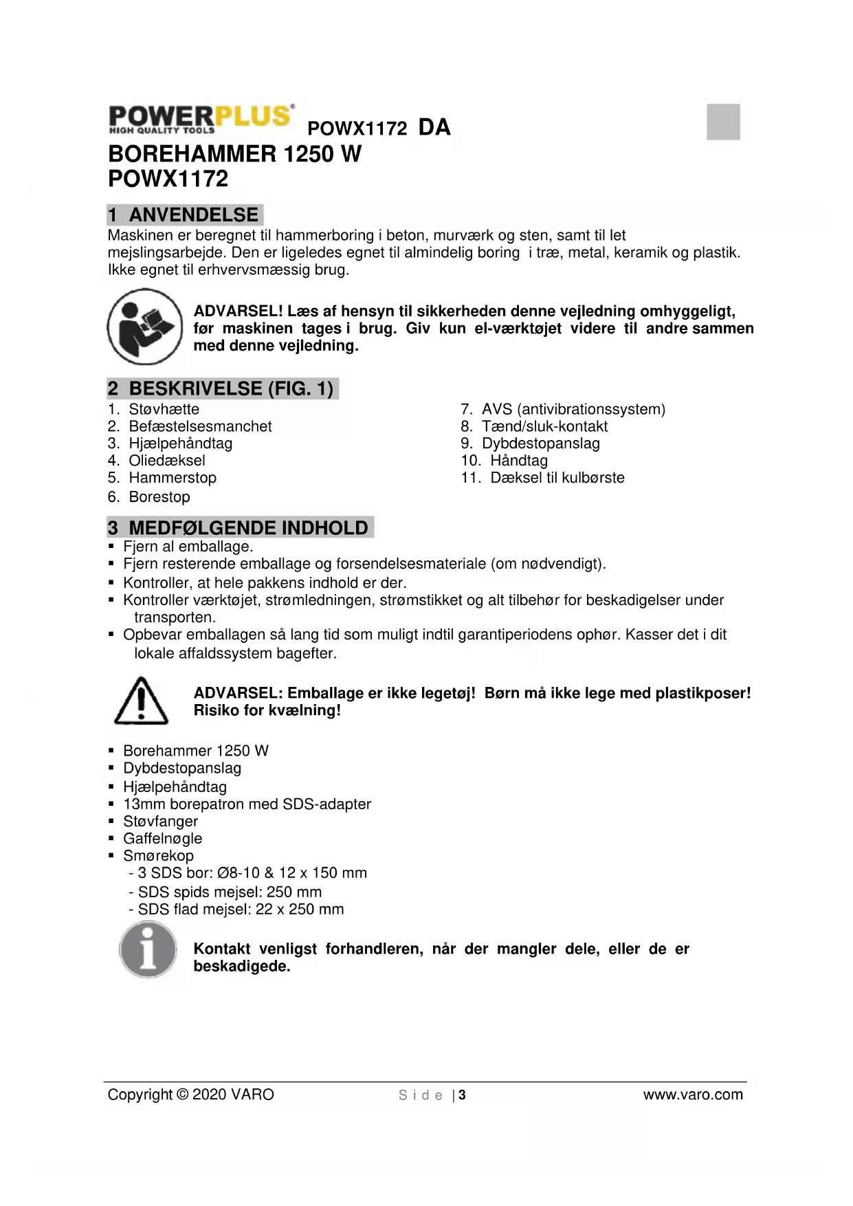 Værktøjet må kun repareres af kvalificeret fagpersonale og med originale reservedele. Dette sikrer, at værktøjets sikkerhed bevares.POWX1172 DA Copyright © 2020 VARO S i d e | 6 www.varo.com 6 SPECIFIKKE SIKKERHEDSFORSKRIFTER Kontroller den angivne spænding (V) på typeskiltet. Ved anvendelse af kabeltromler skal ledningen rulles helt ud. Ledningstværsnit min. 1,0 mm². Hvis el-borehammeren anvendes udendørs, skal der anvendes en forskriftsmæssig forlængerledning H07RN-F 3G 1,5 mm² med stænkvandsbeskyttet slikanordning. Sørg for at stå sikkert på stiger og stilladser ved frihåndsboring. I vægge, hvor strøm-, vand- eller gasledninger ikke kan ses, skal ledningerne først lokaliseres med en ledningssøger. Undgå at berøre strømførende dele eller ledninger. Bær høreværn til beskyttelse af Deres ører. Tab af hørelse kan være en gradvis proces. Bær beskyttelsesbriller og anvend støvmaske ved støvudviklende arbejde. Må ikke anvendes i områder med dampe og brændbare væsker. Træk stikket ud af stikdåsen ved alt ændrings- og rengøringsarbejde. Beskyt netledningen mod skader. Olie og syre kan beskadige ledningen. Overbelast ikke maskinen. Vigtigt! Alle nationale forskrifter vedrørende installation, drift og vedligeholdelse skal overholdes. Mejsel og bor kan ved uheld slynges ud af værktøjet og forårsage svære kvæstelser: Kontroller altid at mejsel eller bor er låst i patronen, før arbejdet påbegyndes. Kontroller regelmæssigt patronen for slid og skader. Start kun et værktøj med slåfunktion, når det trykkes mod et arbejdsemne (væg, loft osv.). Efter arbejdets afslutning skal borehammeren kobles fra strømnettet og mejsel eller bor tages ud af maskinen Før udskiftning af mejsel eller bor skal borehammeren altid kobles fra strømnettet. Beskyt øjne og medarbejdere mod flyvende smådele og afsplintrede fremmedlegemer. Bær sikkerhedshjelm! Opstil skillevægge! Arbejdshandsker beskytter mod kvæstelse af fingre og hudafskrabninger. Vibrationer kan være skadelige for hænder og arme: tiden for vibrationspåvirkning skal holdes så lav som mulig. Netkablet skal altid føres bagud væk fra apparatet. Opbevar apparatet sådan, at det er utilgængeligt for børn. Under arbejdet skal man altid holde apparatet fast med begge hænder og sørge for at stå sikkert. 7 INDEN IDRIFTTAGNINGEN På anvendelsesstedet skal der med el ledningssøgeapparat søges efter skjulte elektriske ledninger, gas- og vandrør. Inden tilslutningen til strømnettet skal man sørge for, at netspændingen stemmer overens med angivelserne på mærkepladen.