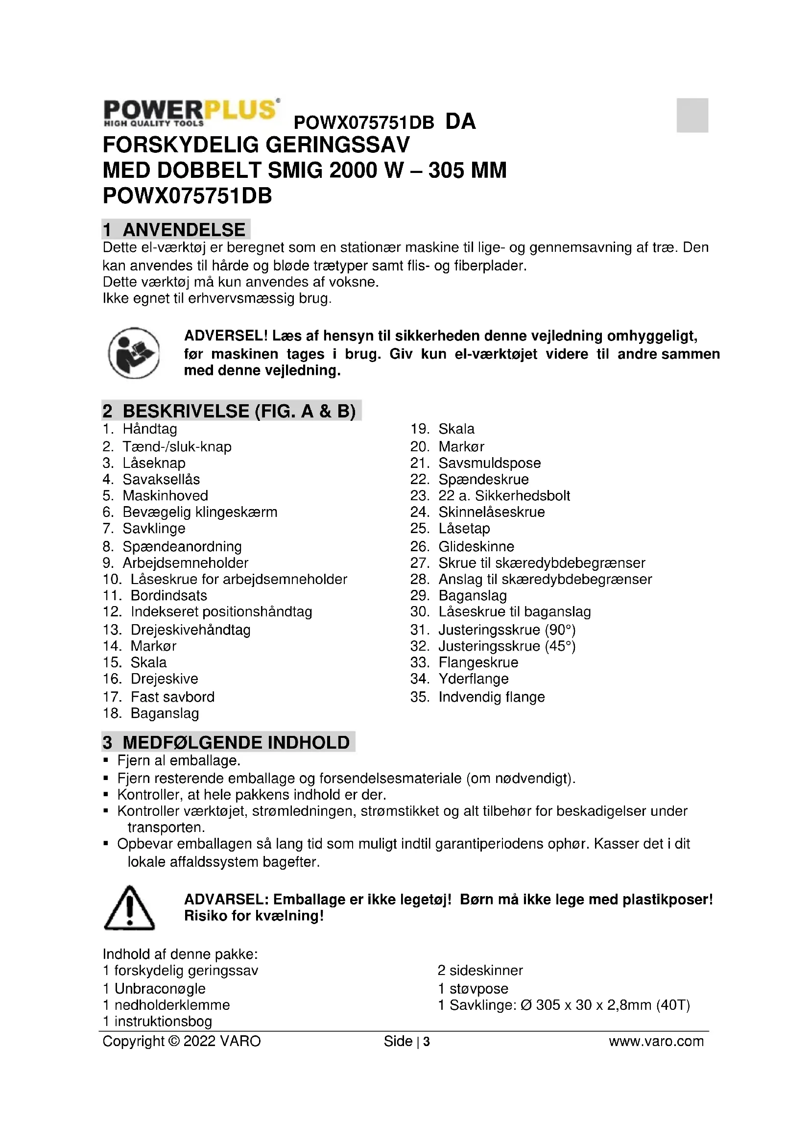 Klingens størrelse 305 mm x 30 mm x 2,8 mm 12 SAVEKAPACITET Vinkel for arbejdsbord Hældningsvinkel for hoved Højde x bredde (mm) 90° 90° 105 x 330 mm 45° 90° 105 x 230 mm 90° 45° 60 x 330 mm (venstre) 90° 45° 33 x 330 mm (højre) 45° 45° 60 x 230 mm (venstre) 45° 45° 33 x 230 mm (højre) 13 STØJ Støjemissionsværdier er målt i overensstemmelse med gældende standarder. (K=3) Lydtryksniveau LpA 95 dB(A) Lydeffektniveau LwA 108 dB(A) BEMÆRK: brug høreværn når lydtrykket er over 85 dB(A).POWX075751DB DA Copyright © 2022 VARO Side | 12 www.varo.com 14 OPBEVARING