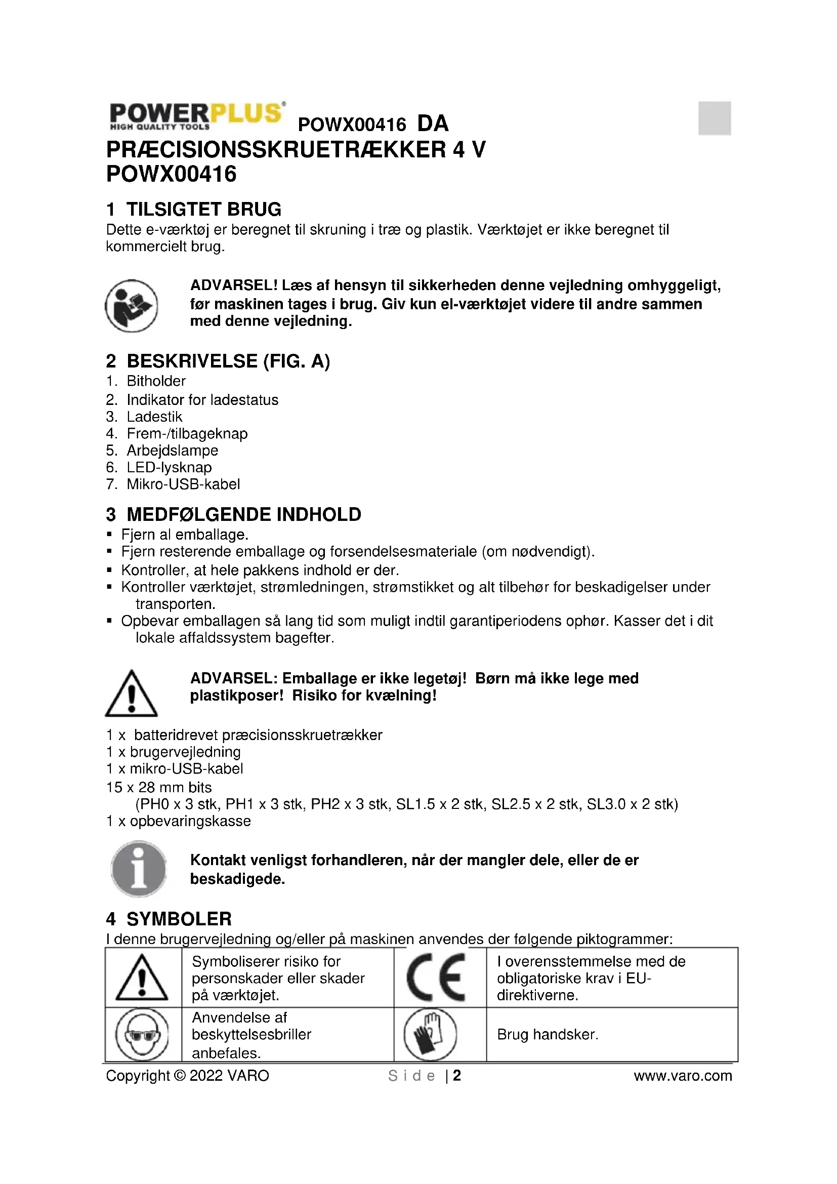 - Overvurdér ikke dine evner. Sørg altid for, at du står sikkert og er i balance. På denne måde kan værktøjet styres bedre i uventede situationer.POWX00416 DA Copyright © 2022 VARO S i d e | 4 www.varo.com