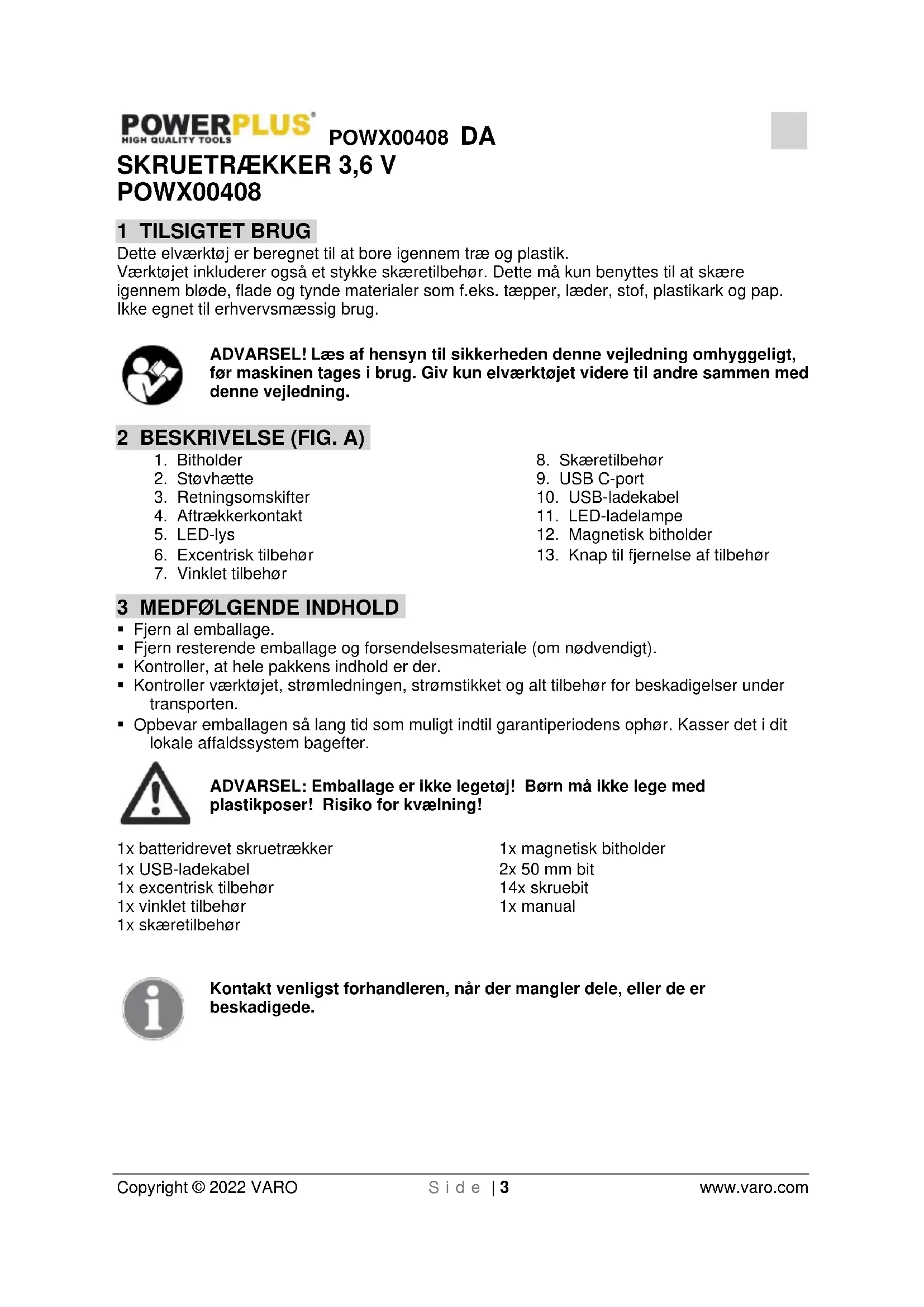 - Opbevar emballagen så lang tid som muligt indtil garantiperiodens ophør. Kasser det i dit lokale affaldssystem bagefter. ADVARSEL: Emballage er ikke legetøj! Børn må ikke lege med plastikposer! Risiko for kvælning! 1x batteridrevet skruetrækker 1x USB-ladekabel 1x excentrisk tilbehør 1x vinklet tilbehør 1x skæretilbehør 1x magnetisk bitholder 2x 50 mm bit 14x skruebit 1x manual Kontakt venligst forhandleren, når der mangler dele, eller de er beskadigede.POWX00408 DA Copyright © 2022 VARO S i d e | 4 www.varo.com 4 SYMBOLER I denne brugervejledning og/eller på maskinen anvendes der følgende piktogrammer: