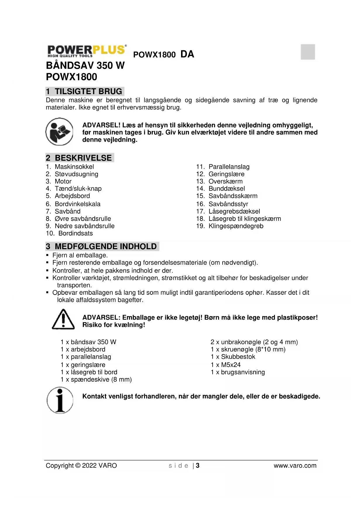 - Opbevar emballagen så lang tid som muligt indtil garantiperiodens ophør. Kasser det i dit lokale affaldssystem bagefter. ADVARSEL: Emballage er ikke legetøj! Børn må ikke lege med plastikposer! Risiko for kvælning! 1 x båndsav 350 W 1 x arbejdsbord 1 x parallelanslag 1 x geringslære 1 x låsegreb til bord 1 x spændeskive (8 mm) 2 x unbrakonøgle (2 og 4 mm) 1 x skruenøgle (8*10 mm) 1 x Skubbestok 1 x M5x24 1 x brugsanvisning Kontakt venligst forhandleren, når der mangler dele, eller de er beskadigede.POWX1800 DA Copyright © 2022 VARO s i d e | 4 www.varo.com 4 SYMBOLER I denne brugervejledning og/eller på maskinen anvendes der følgende piktogrammer: