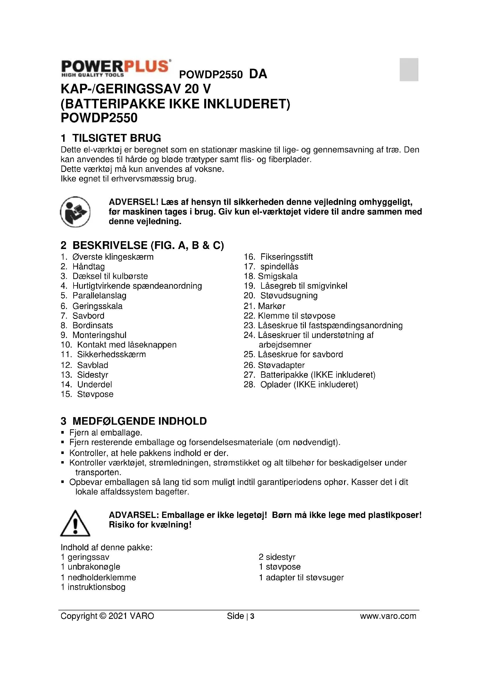 - Opbevar emballagen så lang tid som muligt indtil garantiperiodens ophør. Kasser det i dit lokale affaldssystem bagefter. ADVARSEL: Emballage er ikke legetøj! Børn må ikke lege med plastikposer! Risiko for kvælning! Indhold af denne pakke: 1 geringssav 1 unbrakonøgle 1 nedholderklemme 1 instruktionsbog 2 sidestyr 1 støvpose 1 adapter til støvsugerPOWDP2550 DA Copyright © 2021 VARO Side | 4 www.varo.com Kontakt venligst forhandleren, når der mangler dele, eller de er beskadigede. 4 SYMBOLER I denne brugervejledning og/eller på maskinen anvendes der følgende piktogrammer: