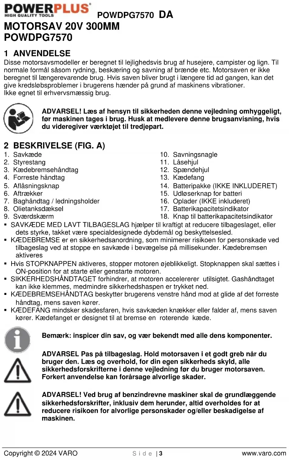 - KÆDEFANG mindsker skadesfaren, hvis savkæden knækker eller falder af, mens saven kører. Kædefanget er designet til at bremse en roterende kæde. Bemærk: inspicer din sav, og vær bekendt med alle dens komponenter. ADVARSEL Pas på tilbageslag. Hold motorsaven i et godt greb når du bruger den. Læs og overhold, for din egen sikkerheds skyld, alle sikkerhedsforskrifterne i denne vejledning før du bruger motorsaven. Forkert anvendelse kan forårsage alvorlige skader. ADVARSEL! Ved brug af benzindrevne maskiner skal de grundlæggende sikkerhedsforskrifter, inklusiv dem herunder, altid overholdes for at reducere risikoen for alvorlige personskader og/eller beskadigelse af maskinen.POWDPG7570 DA Copyright © 2024 VARO S i d e | 4 www.varo.com