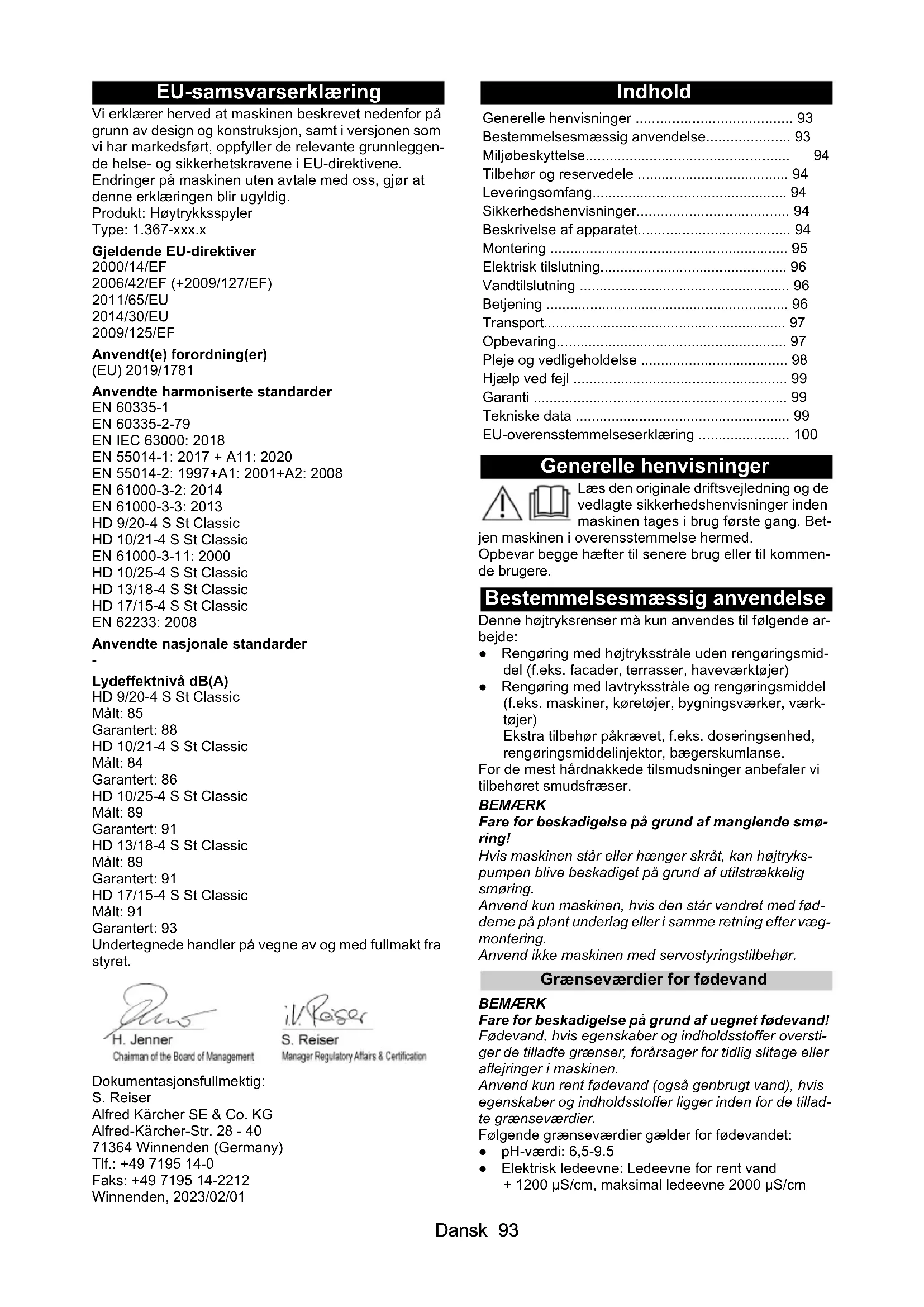 - Lydeffektnivå dB(A) HD 9/20-4 S St Classic Målt: 85 Garantert: 88 HD 10/21-4 S St Classic Målt: 84 Garantert: 86 HD 10/25-4 S St Classic Målt: 89 Garantert: 91 HD 13/18-4 S St Classic Målt: 89 Garantert: 91 HD 17/15-4 S St Classic Målt: 91 Garantert: 93 Undertegnede handler på vegne av og med fullmakt fra styret. Dokumentasjonsfullmektig: S. Reiser Alfred Kärcher SE & Co. KG Alfred-Kärcher-Str. 28 - 40 71364 Winnenden (Germany) Tlf.: +49 7195 14-0 Faks: +49 7195 14-2212 Winnenden, 2023/02/01 Indhold Generelle henvisninger Læs den originale driftsvejledning og de vedlagte sikkerhedshenvisninger inden maskinen tages i brug første gang. Bet- jen maskinen i overensstemmelse hermed. Opbevar begge hæfter til senere brug eller til kommen- de brugere. Bestemmelsesmæssig anvendelse Denne højtryksrenser må kun anvendes til følgende ar- bejde: ● Rengøring med højtryksstråle uden rengøringsmid- del (f.eks. facader, terrasser, haveværktøjer) ● Rengøring med lavtryksstråle og rengøringsmiddel (f.eks. maskiner, køretøjer, bygningsværker, værk- tøjer) Ekstra tilbehør påkrævet, f.eks. doseringsenhed, rengøringsmiddelinjektor, bægerskumlanse. For de mest hårdnakkede tilsmudsninger anbefaler vi tilbehøret smudsfræser. BEMÆRK Fare for beskadigelse på grund af manglende smø- ring! Hvis maskinen står eller hænger skråt, kan højtryks- pumpen blive beskadiget på grund af utilstrækkelig smøring. Anvend kun maskinen, hvis den står vandret med fød- derne på plant underlag eller i samme retning efter væg- montering. Anvend ikke maskinen med servostyringstilbehør. Grænseværdier for fødevand BEMÆRK Fare for beskadigelse på grund af uegnet fødevand! Fødevand, hvis egenskaber og indholdsstoffer oversti- ger de tilladte grænser, forårsager for tidlig slitage eller aflejringer i maskinen. Anvend kun rent fødevand (også genbrugt vand), hvis egenskaber og indholdsstoffer ligger inden for de tillad- te grænseværdier. Følgende grænseværdier gælder for fødevandet: ● pH-værdi: 6,5-9.5 ● Elektrisk ledeevne: Ledeevne for rent vand + 1200 µS/cm, maksimal ledeevne 2000 µS/cm Generelle henvisninger p. 93