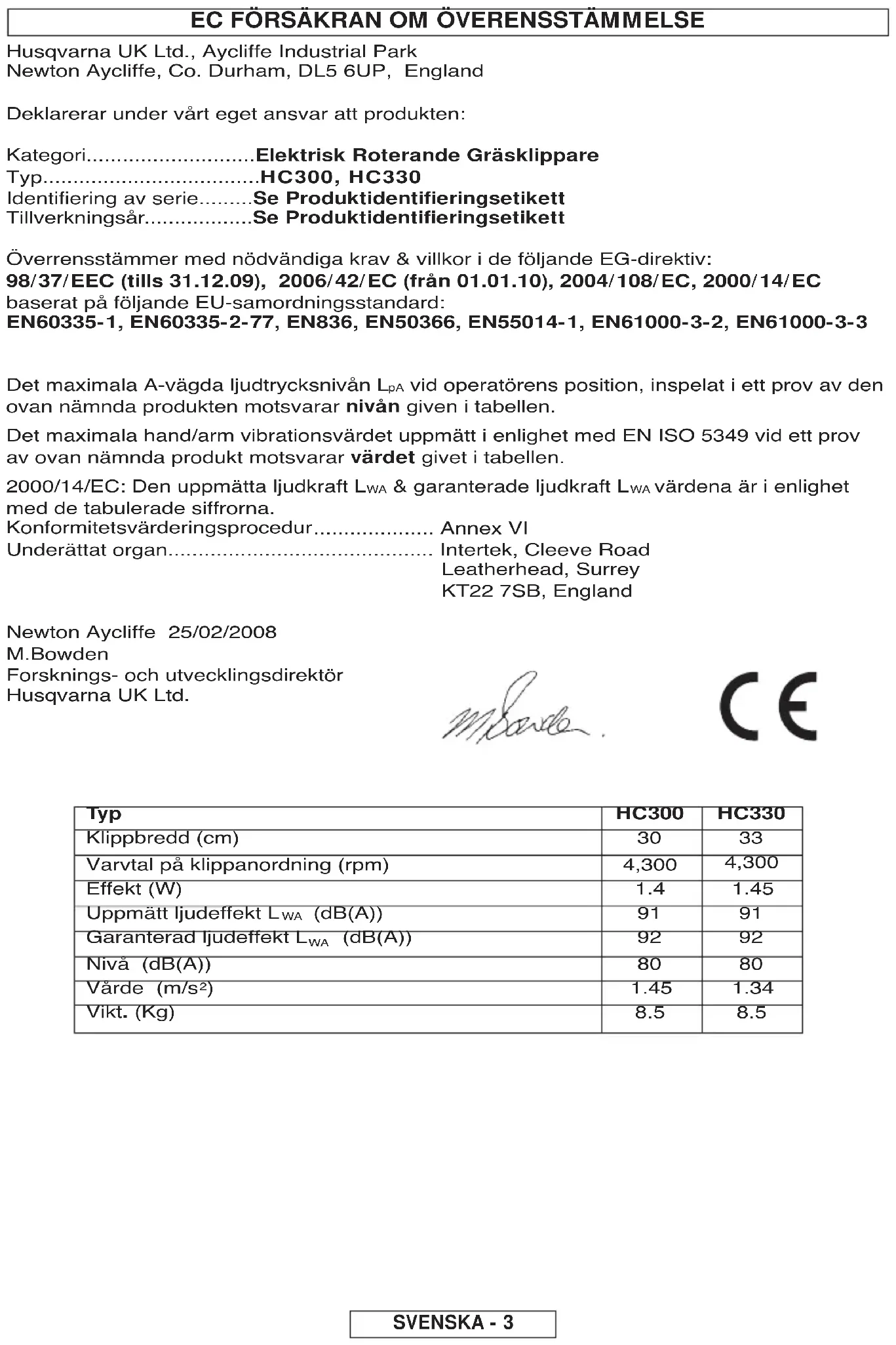 - Forsigtig! Husqvarna UK Ltd. kan under garantien ikke påtage sig ansvaret for fejl, der helt eller delvist, direkte eller indirekte skyldes monteringen af reservedele eller ek- stradele, der ikke er fremstillet eller godkendt af Husq- varna UK Ltd., eller at maskinen er blevet modificeret på nogen måde.EC OVERENSSTEMMELSESERKLÆRING Husqvarna UK Ltd., Aycliffe Industrial Park Newton Aycliffe, Co. Durham, DL5 6UP, England Vi erklærer herved under eneansvar, at produktet/produkterne: Kategori .............................Elektrisk roterende græsslåmaskine Type ...............................HC300, HC330 Identifikation af serie.........Se Produktmærkat Fremstillingsår ...................Se Produktmærkat Holder overensstemmelse med de væsentlige krav og bestemmelser i følgende EU-direktiver: 98/37/EEC (til og med 31.12.09), 2006/42/EC (fra og med 01.01.10), 2004/108/EC, 2000/14/EC på grundlag af følgende anvendte EU-harmoniserede standarder: EN60335-1, EN60335-2-77, EN836, EN50366, EN55014-1, EN61000-3-2, EN61000-3-3 Det maksimale A-vægtede lydtrykniveau, L