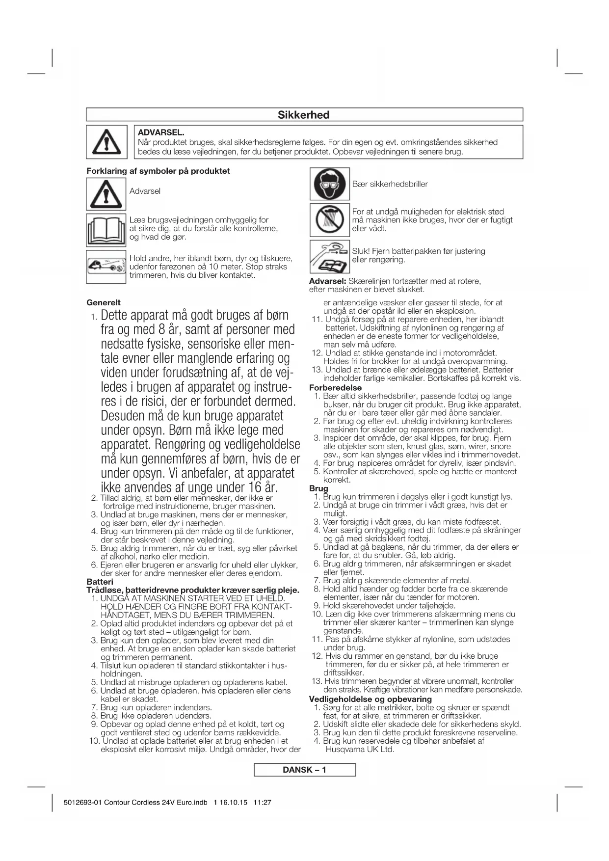 Husqvarna UK Ltd. 5012693-01 Contour Cordless 24V Euro.indb 1 16.10.15 11:27DANSK – 2