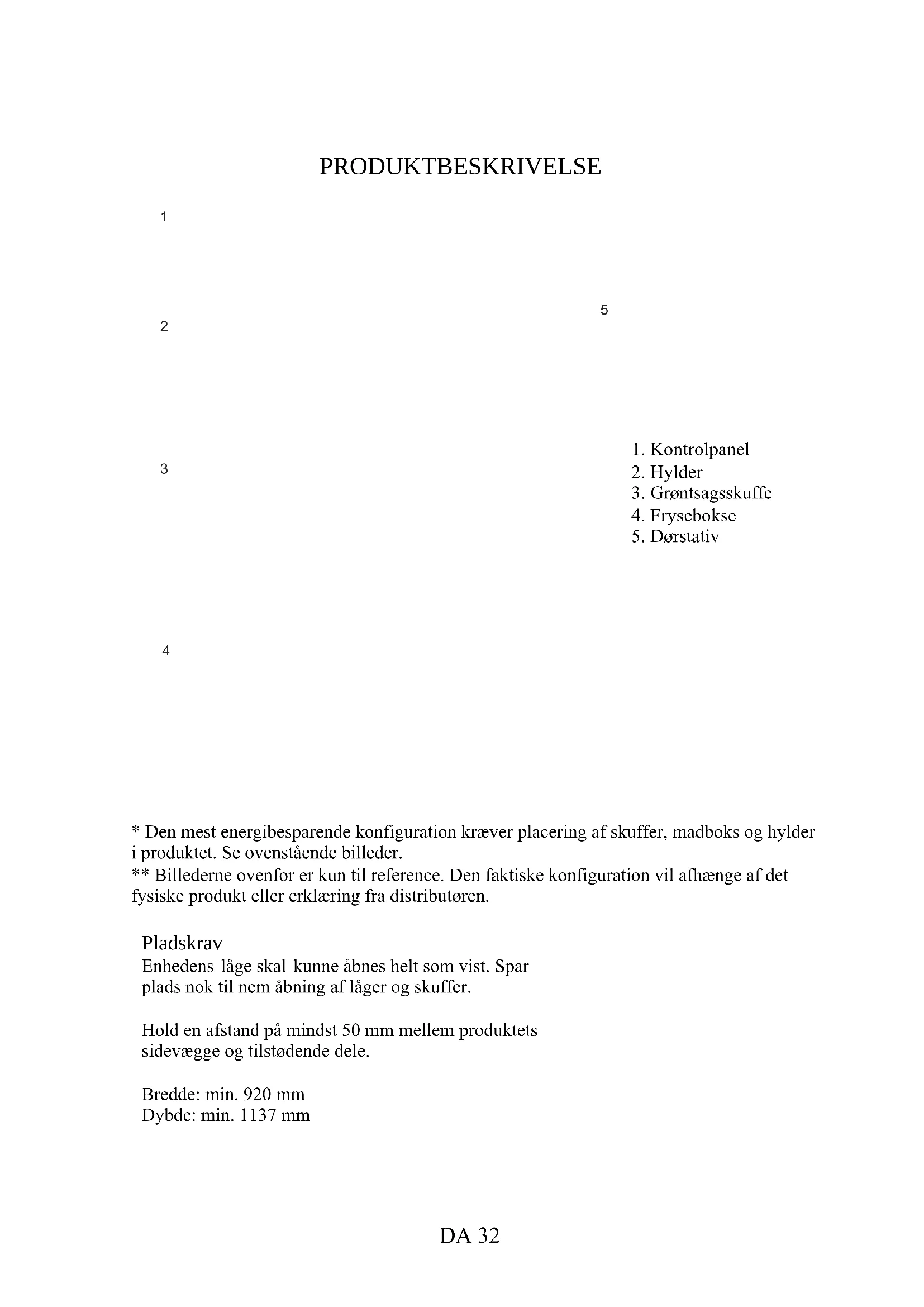 - Den mest energibesparende konfiguration kræver placering af skuffer, madboks og hylder i produktet. Se ovenstående billeder. ** Billederne ovenfor er kun til reference. Den faktiske konfiguration vil afhænge af det fysiske produkt eller erklæring fra distributøren. Pladskrav Enhedens låge skal kunne åbnes helt som vist. Spar plads nok til nem åbning af låger og skuffer. Hold en afstand på mindst 50 mm mellem produktets sidevægge og tilstødende dele. Bredde: min. 920 mm Dybde: min. 1137 mm