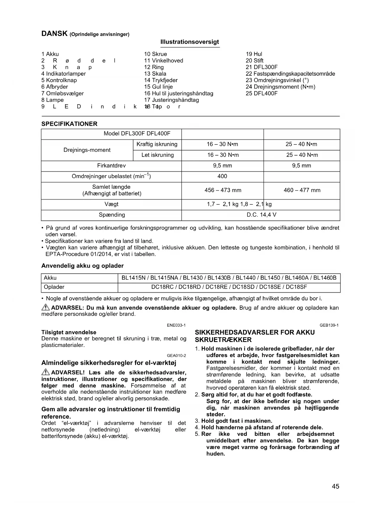 umiddelbart efter anvendelse. De kan begge være meget varme og forårsage forbrænding af huden. Model DFL300F DFL400F Drejnings-moment Kraftig iskruning 16 – 30 N•m 25 – 40 N•m Let iskruning 16 – 30 N•m 25 – 40 N•m Firkantdrev 9,5 mm 9,5 mm Omdrejninger ubelastet (min