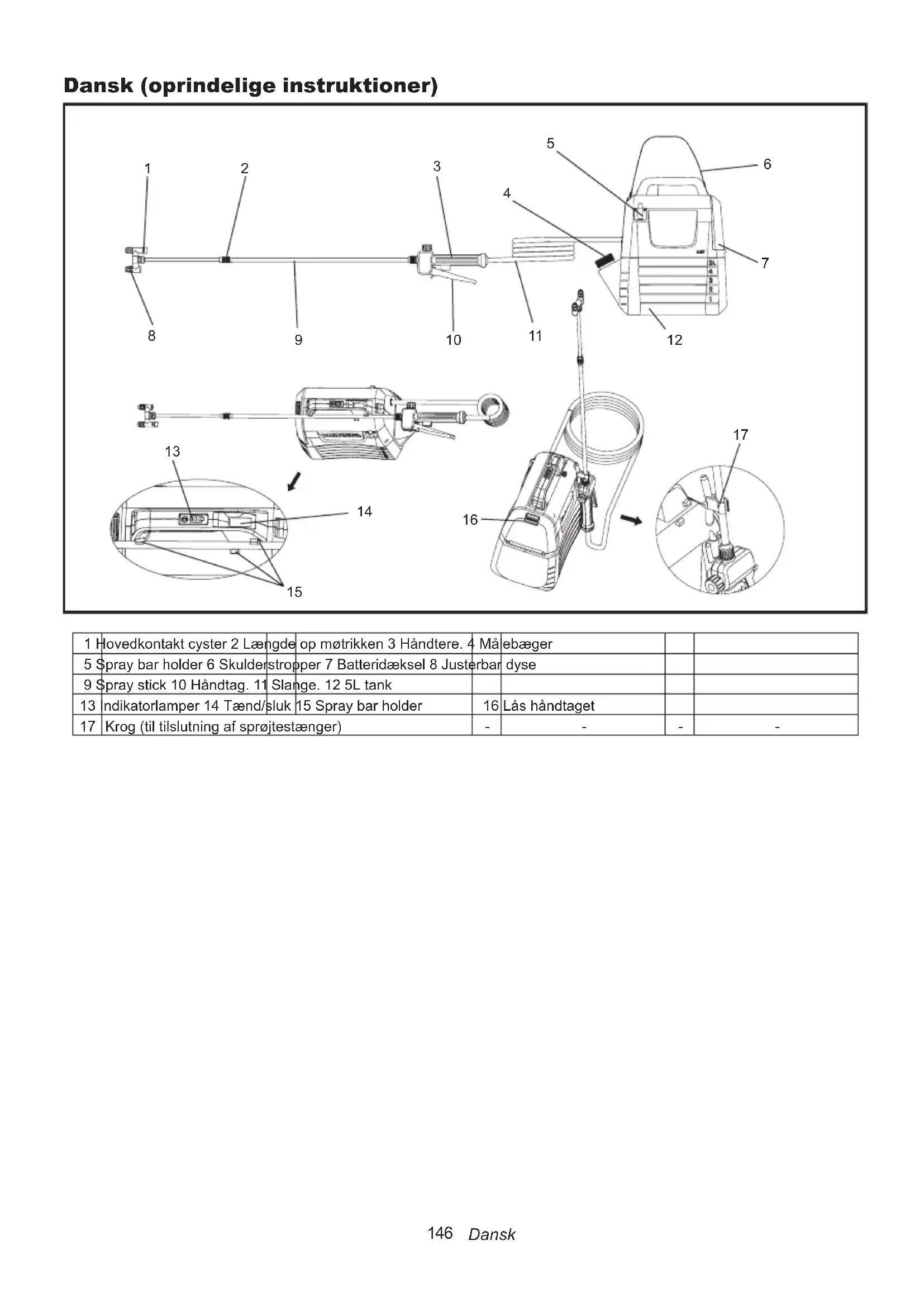 - Containere er ikke inkluderet. Figur 7 Figur 8 Figur 9 Figur 10 Figur 11160 Dansk ADVARSEL! Risiko for brand eller eksplosion. Sprøjteområdet skal være godt ventileret og væk fra gnister eller ammer. DRIFT FORSIGTIG: Bind altid skulderremmen fast til skulderen, når du betjener maskinen. Tænd/sluk for maskinen