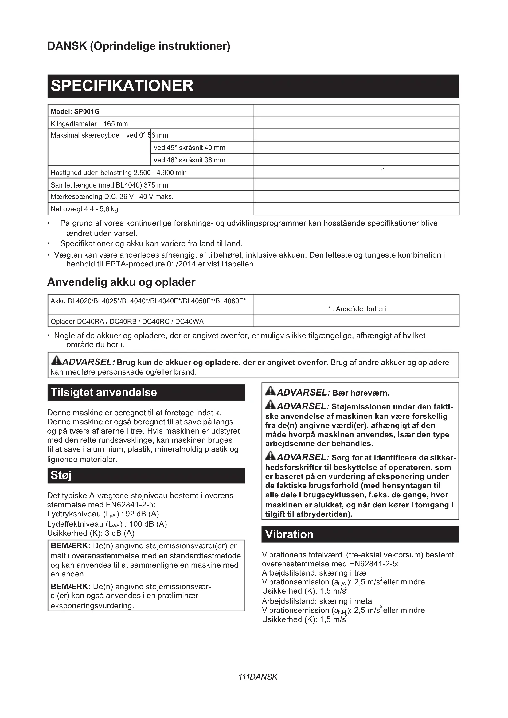 - Nogle af de akkuer og opladere, der er angivet ovenfor, er muligvis ikke tilgængelige, afhængigt af hvilket område du bor i. ADVARSEL: Brug kun de akkuer og opladere, der er angivet ovenfor. Brug af andre akkuer og opladere kan medføre personskade og/eller brand. Tilsigtet anvendelse Denne maskine er beregnet til at foretage indstik. Denne maskine er også beregnet til at save på langs ogpåtværsafårerneitræ.Hvismaskinenerudstyret med den rette rundsavsklinge, kan maskinen bruges til at save i aluminium, plastik, mineralholdig plastik og lignende materialer. Støj DettypiskeA-vægtedestøjniveaubestemtioverens- stemmelse med EN62841-2-5: Lydtryksniveau(L