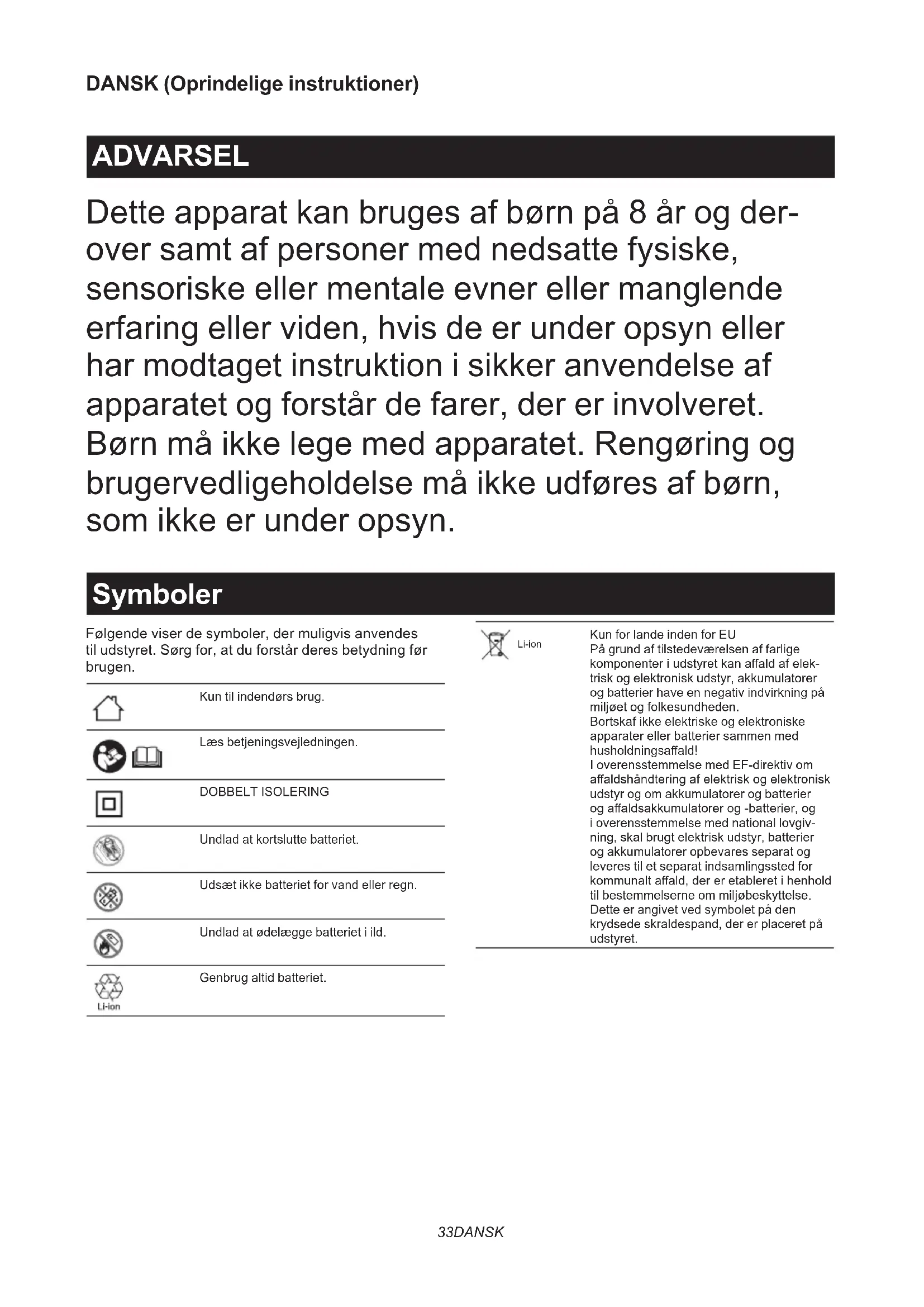 ► Fig.633 DANSK DANSK (Oprindelige instruktioner) ADVARSEL Dette apparat kan bruges af børn på 8 år og der- over samt af personer med nedsatte fysiske, sensoriske eller mentale evner eller manglende erfaring eller viden, hvis de er under opsyn eller har modtaget instruktion i sikker anvendelse af apparatet og forstår de farer, der er involveret. Børn må ikke lege med apparatet. Rengøring og brugervedligeholdelse må ikke udføres af børn, som ikke er under opsyn. Symboler Følgende viser de symboler, der muligvis anvendes til udstyret. Sørg for, at du forstår deres betydning før brugen. Kun til indendørs brug. Læs betjeningsvejledningen. DOBBELT ISOLERING Undlad at kortslutte batteriet. Udsæt ikke batteriet for vand eller regn. Undlad at ødelægge batteriet i ild. Genbrug altid batteriet. Li-ion Kun for lande inden for EU På grund af tilstedeværelsen af farlige komponenter i udstyret kan aald af elek- trisk og elektronisk udstyr, akkumulatorer og batterier have en negativ indvirkning på miljøet og folkesundheden. Bortskaf ikke elektriske og elektroniske apparater eller batterier sammen med husholdningsaald! I overensstemmelse med EF-direktiv om aaldshåndtering af elektrisk og elektronisk udstyr og om akkumulatorer og batterier og aaldsakkumulatorer og -batterier, og i overensstemmelse med national lovgiv- ning, skal brugt elektrisk udstyr, batterier og akkumulatorer opbevares separat og leveres til et separat indsamlingssted for kommunalt aald, der er etableret i henhold til bestemmelserne om miljøbeskyttelse. Dette er angivet ved symbolet på den krydsede skraldespand, der er placeret på udstyret.34 DANSK ► Fig.1 Klar til opladning. Forsinket opladning (batteriet køler, for koldt batteri eller venter på opladning). Oplader (0 - 80 %). Oplader (80 - 100 %). Opladning er færdig. Oplader (Unormal afkøling). Defekt batteri. FORSIGTIG