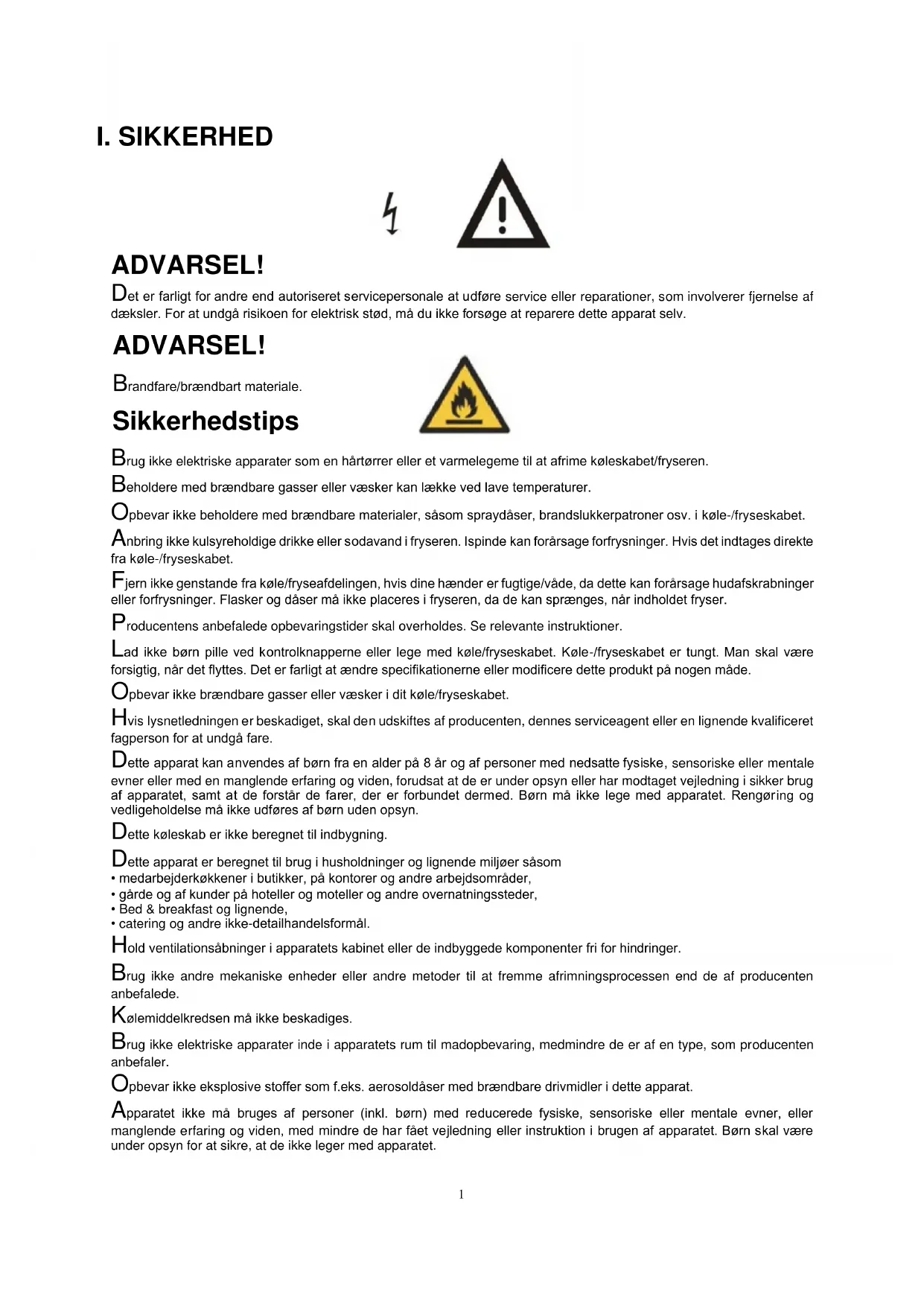 - catering og andre ikke-detailhandelsformål. Hold ventilationsåbninger i apparatets kabinet eller de indbyggede komponenter fri for hindringer. Brug ikke andre mekaniske enheder eller andre metoder til at fremme afrimningsprocessen end de af producenten anbefalede. Kølemiddelkredsen må ikke beskadiges. Brug ikke elektriske apparater inde i apparatets rum til madopbevaring, medmindre de er af en type, som producenten anbefaler. Opbevar ikke eksplosive stoffer som f.eks. aerosoldåser med brændbare drivmidler i dette apparat. Apparatet ikke må bruges af personer (inkl. børn) med reducerede fysiske, sensoriske eller mentale evner, eller manglende erfaring og viden, med mindre de har fået vejledning eller instruktion i brugen af apparatet. Børn skal være under opsyn for at sikre, at de ikke leger med apparatet.2 - ADVARSEL: Hold ventilationsåbninger i apparatets kabinet eller de indbyggede komponenter fri for hindringer. - ADVARSEL: Brug ikke andre mekaniske enheder eller andre metoder til at fremme afrimningsprocessen end de af producenten anbefalede. - ADVARSEL: Kølemiddelkredsen må ikke beskadiges. - ADVARSEL: Brug ikke elektriske apparater inde i madopbevaringsrummet, medmindre de er af en type, som producenten anbefaler. - ADVARSEL: Køleskabet -især et køle/fryseskab af Type I - fungerer måske ikke stabilt (risiko for afrimning af indhold eller for høje temperaturer i frostvarerummet) hvis det anbringes et sted, hvor der er koldere end den mindste omgivelsestemperatur, køleskabet er beregnet til. - ADVARSEL: Hvis køle/fryseskabets låger eller låg er udstyret med låse og nøgler, skal nøglerne opbevares utilgængeligt for børn på et sted, der ikke er lige i nærheden af køleskabet, så børnene ikke ved et uheld kan låses inde i køleskabet. - ADVARSEL: Kølemidlet, der bruges i dit apparat og isoleringsmaterialer, kræver særlige bortskaffelsesprocedurer. - ADVARSEL: Når apparatet placeres, skal det sikres, at lysnetledningen ikke er fastklemt eller beskadiget. - ADVARSEL: Placér ikke flere løse forgrenerledninger eller bærbare strømforsyninger bag ved apparatet Børn i alderen 3 til 8 år har lov til at sætte ting i og tage dem ud af apparatet. Undgå kontaminering af fødevarer ved at overholde følgende instruktioner: - Åbning af lågen i længere tid kan medføre en væsentlig temperaturstigning i køleskabet. - Rengør regelmæssigt de overflader, der kan komme i kontakt med madvarer, og de tilgængelige afløbssystemer. - Rengør vandbeholderne, hvis de ikke er blevet brugt i 48 timer. Skyl det vandsystem, der er forbundet med vandforsyningen, hvis der ikke er brugt vand i 5 dage. - Opbevar ferskt kød og fisk i egnede fade eller bokse i køleskabet, så de ikke drypper på eller er i kontakt med andre fødevarer. - To-stjernede fryserum er velegnede til opbevaring af frostvarer, opbevaring eller fremstilling af is og fremstilling af isterninger. - Et-, to- og trestjernede rum er ikke egnede til frysning af ferskvarer. - Hvis køleskabet efterlades tomt i længere tid, skal det slukkes, afrimes, rengøres, tørres og efterlades med lågen åbnet, så der ikke opstår mug i køleskabet. Låse Hvis fryseskabet er udstyret med en lås, skal nøglen opbevares utilgængeligt og ikke i nærheden af apparatet for at forhindre, at børn bliver spærret inde i det. Hvis du bortskaffer et gammelt fryseskab, skal du afmontere eventuelle gamle låse eller lignende som en sikkerhedsforanstaltning. Freonfri Til køleskabet bruges det freonfrie kølemiddel (R600a) og skumisoleringsmaterialet (cyclopentan), der er miljøvenligt og ikke forårsager skade på ozonlaget og dermed har en meget lille indvirkning på den globale opvarmning. R600a er brandfarligt og forseglet i et køleanlæg, uden lækage ved normal brug. Men i tilfælde af kølemiddellækage på grund af beskadigelse af kølemiddelkredsløbet, skal du sørge for at holde apparatet væk fra åben ild og åbne vinduerne for ventilation så hurtigt som muligt.3 INTRODUKTION Tips til vanddispenser Køleskabet indeholder en vanddispenser, som gør det nemmere at fylde en kop med vand, så du har adgang til koldt vand næsten med det samme. Vandbeholderen indeholder en tank med 2,0 liter vand, som skal fyldes op. Følg instruktionerne nedenfor for at bruge vanddispenseren: