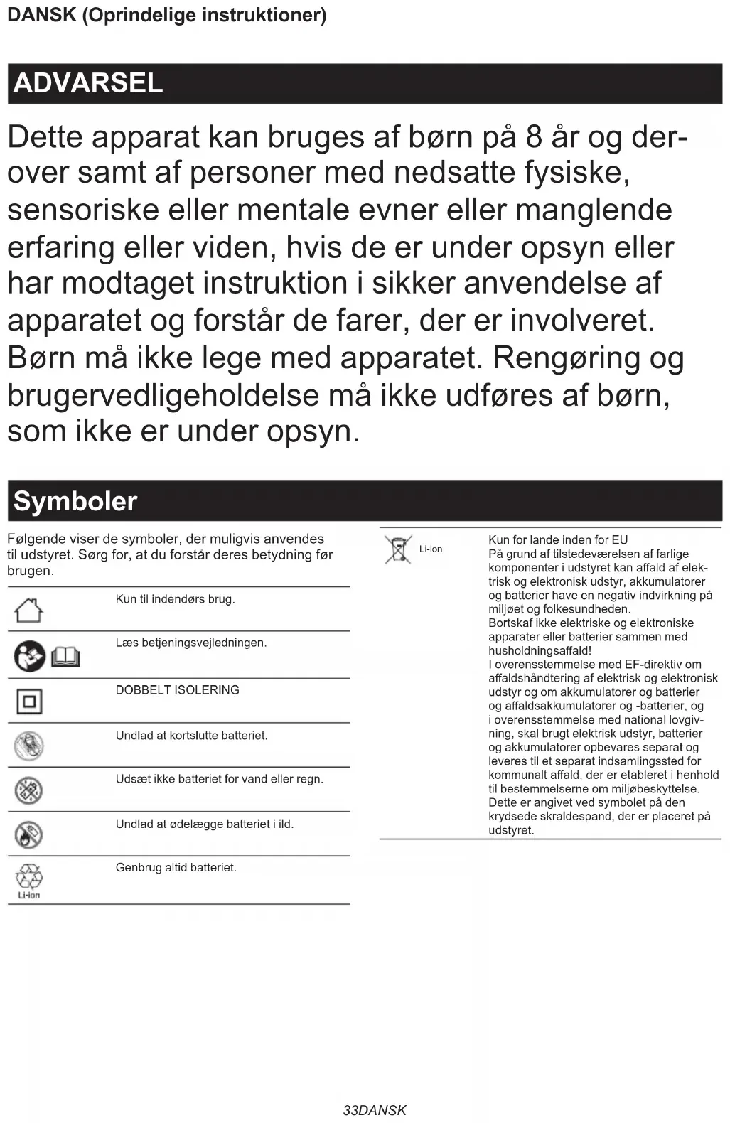 ► Fig.533 DANSK DANSK (Oprindelige instruktioner) ADVARSEL Dette apparat kan bruges af børn på 8 år og der- over samt af personer med nedsatte fysiske, sensoriske eller mentale evner eller manglende erfaring eller viden, hvis de er under opsyn eller har modtaget instruktion i sikker anvendelse af apparatet og forstår de farer, der er involveret. Børn må ikke lege med apparatet. Rengøring og brugervedligeholdelse må ikke udføres af børn, som ikke er under opsyn. Symboler Følgende viser de symboler, der muligvis anvendes til udstyret. Sørg for, at du forstår deres betydning før brugen. Kun til indendørs brug. Læs betjeningsvejledningen. DOBBELT ISOLERING Undlad at kortslutte batteriet. Udsæt ikke batteriet for vand eller regn. Undlad at ødelægge batteriet i ild. Genbrug altid batteriet. Li-ion Kun for lande inden for EU På grund af tilstedeværelsen af farlige komponenter i udstyret kan aald af elek- trisk og elektronisk udstyr, akkumulatorer og batterier have en negativ indvirkning på miljøet og folkesundheden. Bortskaf ikke elektriske og elektroniske apparater eller batterier sammen med husholdningsaald! I overensstemmelse med EF-direktiv om aaldshåndtering af elektrisk og elektronisk udstyr og om akkumulatorer og batterier og aaldsakkumulatorer og -batterier, og i overensstemmelse med national lovgiv- ning, skal brugt elektrisk udstyr, batterier og akkumulatorer opbevares separat og leveres til et separat indsamlingssted for kommunalt aald, der er etableret i henhold til bestemmelserne om miljøbeskyttelse. Dette er angivet ved symbolet på den krydsede skraldespand, der er placeret på udstyret.34 DANSK Klar til opladning. Forsinket opladning (batteriet køler, for koldt batteri eller venter på opladning). Oplader (0 - 80 %). Oplader (80 - 100 %). Opladning er færdig. Oplader (Unormal afkøling). Defekt batteri. FORSIGTIG