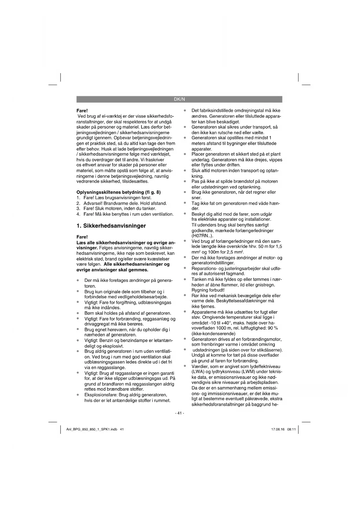 Generatoren er bygget til anvendelser, som er forberedt for drift via en 230 V vekselspændings- kilde. Det er vigtigt, at du følger begrænsningsda- taene ifølge sikkerhedsanvisningerne. Generato- rens formål er at levere energi til drift af el-værktøj og strøm til belysningskilder. Til brug i forbindelse med husholdningsapparater skal du kontrollere egnetheden i henhold til pro- ducentens oplysninger. Er du i tvivl, så spørg en autoriseret fagmand. Saven må kun anvendes i overensstemmelse med dens tiltænkte formål. Enhver anden form for anvendelse er ikke tilladt. Vi fraskriver os eth- vert ansvar for skader, det være sig på personer eller materiel, som måtte opstå som følge af, at maskinen ikke er blevet anvendt korrekt. Ansvaret bæres alene af brugeren/ejeren. Bemærk, at vore produkter ikke er konstrueret til erhvervsmæssig, håndværksmæssig eller indus- triel brug. Vi fraskriver os ethvert ansvar, såfremt produktet anvendes i erhvervsmæssigt, hånd- værksmæssigt, industrielt eller lignende øjemed. Anl_BPG_850_850_1_SPK1.indb 42Anl_BPG_850_850_1_SPK1.indb 42 17.06.16 08:1117.06.16 08:11DK/N
