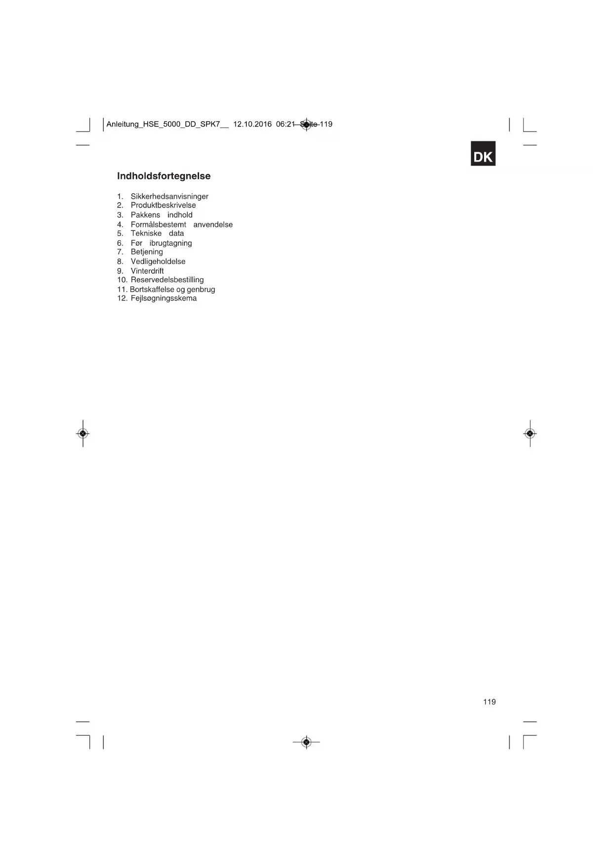 Generatoren leveres indpakket for at undgå transportskader. Emballagen består af råmaterialer og kan genanvendes eller indleveres på genbrugsstation. Generatoren og dens tilbehør består af forskellige materialer, f.eks. metal og plast. Defekte komponenter skal kasseres ifølge miljøforskrifterne og må ikke smides ud som almindeligt husholdningsaffald. Hvis du er i tvivl: Spørg din forhandler, eller forhør dig hos din kommune! Anleitung_HSE_5000_DD_SPK7__ 12.10.2016 06:21 Seite 124125