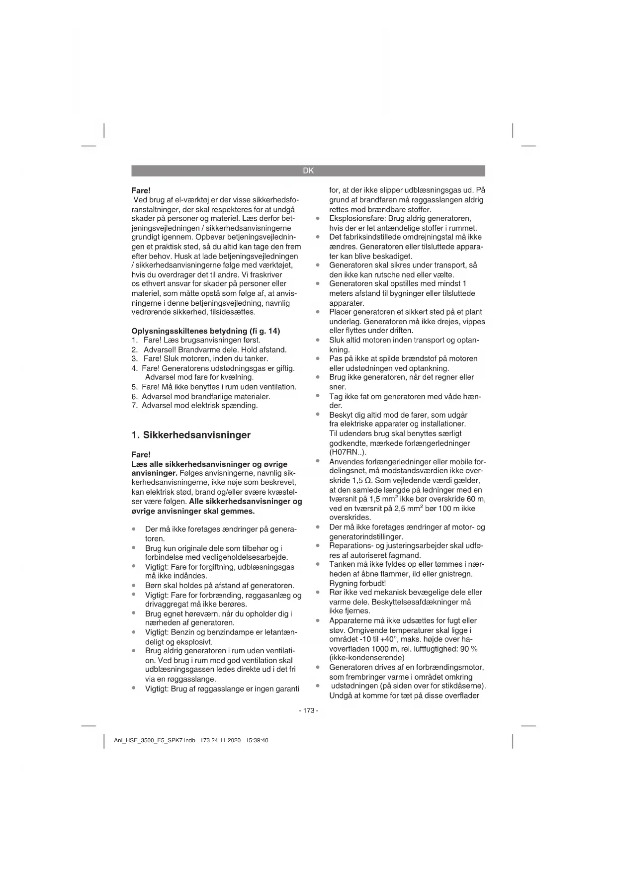 udstødningen (på siden over for stikdåserne). Undgå at komme for tæt på disse overflader Anl_HSE_3500_E5_SPK7.indb 173 24.11.2020 15:39:40DK