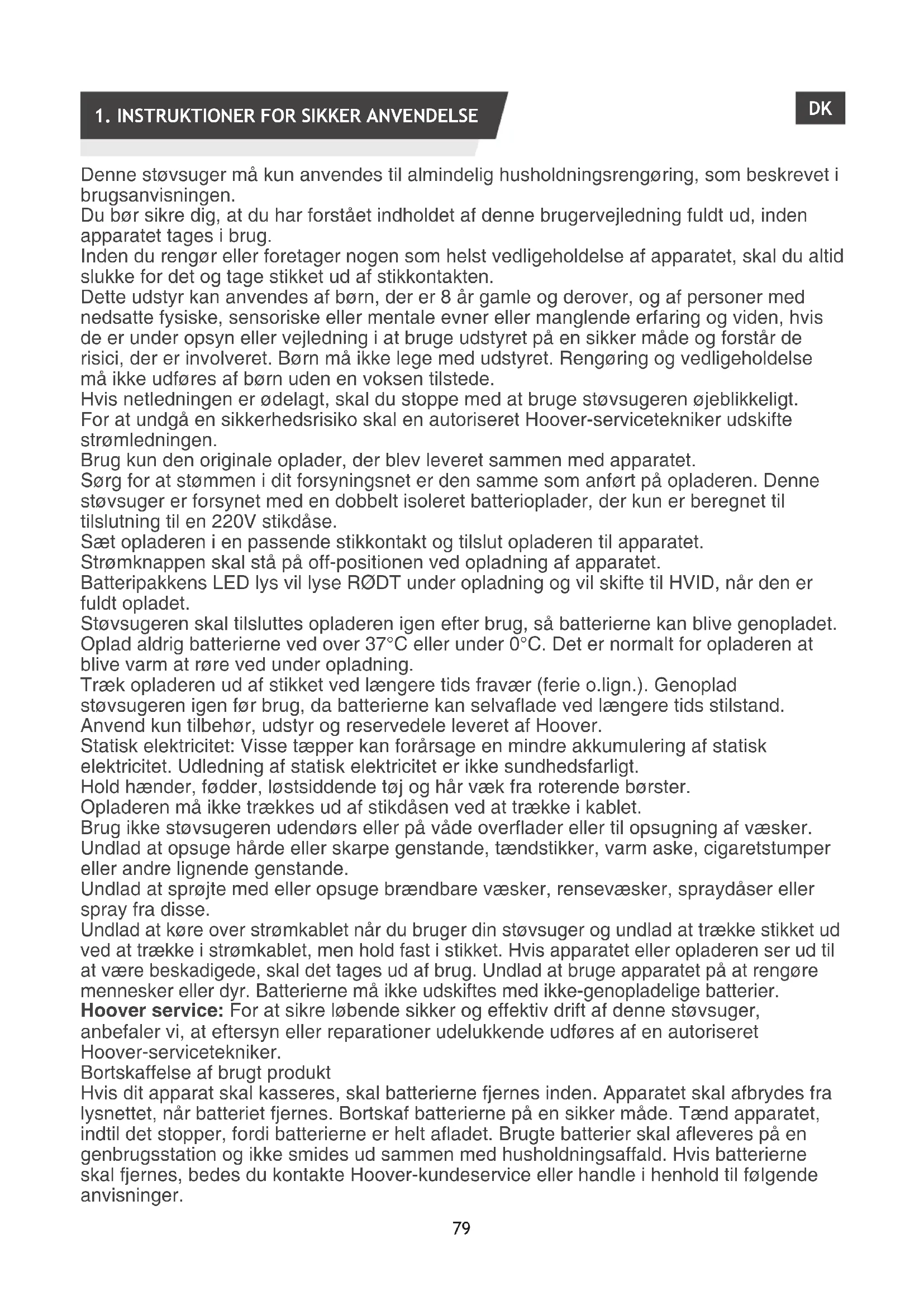 Denne støvsuger må kun anvendes til almindelig husholdningsrengøring, som beskrevet i brugsanvisningen. Du bør sikre dig, at du har forstået indholdet af denne brugervejledning fuldt ud, inden apparatet tages i brug. Inden du rengør eller foretager nogen som helst vedligeholdelse af apparatet, skal du altid slukke for det og tage stikket ud af stikkontakten. Dette udstyr kan anvendes af børn, der er 8 år gamle og derover, og af personer med nedsatte fysiske, sensoriske eller mentale evner eller manglende erfaring og viden, hvis de er under opsyn eller vejledning i at bruge udstyret på en sikker måde og forstår de risici, der er involveret. Børn må ikke lege med udstyret. Rengøring og vedligeholdelse må ikke udføres af børn uden en voksen tilstede. Hvis netledningen er ødelagt, skal du stoppe med at bruge støvsugeren øjeblikkeligt. For at undgå en sikkerhedsrisiko skal en autoriseret Hoover-servicetekniker udskifte strømledningen. Brug kun den originale oplader, der blev leveret sammen med apparatet. Sørg for at stømmen i dit forsyningsnet er den samme som anført på opladeren. Denne støvsuger er forsynet med en dobbelt isoleret batterioplader, der kun er beregnet til tilslutning til en 220V stikdåse. Sæt opladeren i en passende stikkontakt og tilslut opladeren til apparatet. Strømknappen skal stå på off-positionen ved opladning af apparatet. Batteripakkens LED lys vil lyse RØDT under opladning og vil skifte til HVID, når den er fuldt opladet. Støvsugeren skal tilsluttes opladeren igen efter brug, så batterierne kan blive genopladet. Oplad aldrig batterierne ved over 37°C eller under 0°C. Det er normalt for opladeren at blive varm at røre ved under opladning. Træk opladeren ud af stikket ved længere tids fravær (ferie o.lign.). Genoplad støvsugeren igen før brug, da batterierne kan selvaade ved længere tids stilstand. Anvend kun tilbehør, udstyr og reservedele leveret af Hoover. Statisk elektricitet: Visse tæpper kan forårsage en mindre akkumulering af statisk elektricitet. Udledning af statisk elektricitet er ikke sundhedsfarligt. Hold hænder, fødder, løstsiddende tøj og hår væk fra roterende børster. Opladeren må ikke trækkes ud af stikdåsen ved at trække i kablet. Brug ikke støvsugeren udendørs eller på våde overader eller til opsugning af væsker. Undlad at opsuge hårde eller skarpe genstande, tændstikker, varm aske, cigaretstumper eller andre lignende genstande. Undlad at sprøjte med eller opsuge brændbare væsker, rensevæsker, spraydåser eller spray fra disse. Undlad at køre over strømkablet når du bruger din støvsuger og undlad at trække stikket ud ved at trække i strømkablet, men hold fast i stikket. Hvis apparatet eller opladeren ser ud til at være beskadigede, skal det tages ud af brug. Undlad at bruge apparatet på at rengøre mennesker eller dyr. Batterierne må ikke udskiftes med ikke-genopladelige batterier. Hoover service: For at sikre løbende sikker og effektiv drift af denne støvsuger, anbefaler vi, at eftersyn eller reparationer udelukkende udføres af en autoriseret Hoover-servicetekniker. Bortskaffelse af brugt produkt Hvis dit apparat skal kasseres, skal batterierne fjernes inden. Apparatet skal afbrydes fra lysnettet, når batteriet fjernes. Bortskaf batterierne på en sikker måde. Tænd apparatet, indtil det stopper, fordi batterierne er helt aadet. Brugte batterier skal aeveres på en genbrugsstation og ikke smides ud sammen med husholdningsaffald. Hvis batterierne skal fjernes, bedes du kontakte Hoover-kundeservice eller handle i henhold til følgende anvisninger. DK80 VIGTIGT: Aad altid batterierne helt, før de fjernes. Kør med støvsugeren, indtil batterierne er helt tomme. Fjern opladeren fra apparatet. Tryk på batteripakkens udløsningsknapper, og fjern pakken. Bemærk: Hvis du får problemer med at afmontere enheden eller ønsker mere detaljerede oplysninger om behandling, genanvendelse og genbrug af dette produkt, bedes du kontakte kommunen eller skraldeselskabet. Miljøet Symbolet på produktet angiver, at produktet ikke må behandles som husholdningsaald. Det skal i stedet aeveres til en relevant aaldsstation for genbrug af elektrisk og elektronisk udstyr. Bortskaelse skal ske i overensstemmelse med de lokale miljøregler vedrørende bortskaelse af aald. For mere detaljeret information om behandling, genvinding og genbrug af dette produkt, henvend dig da til den lokale kommune, til dit aaldsselskab eller den forretning, hvor du købte produktet.