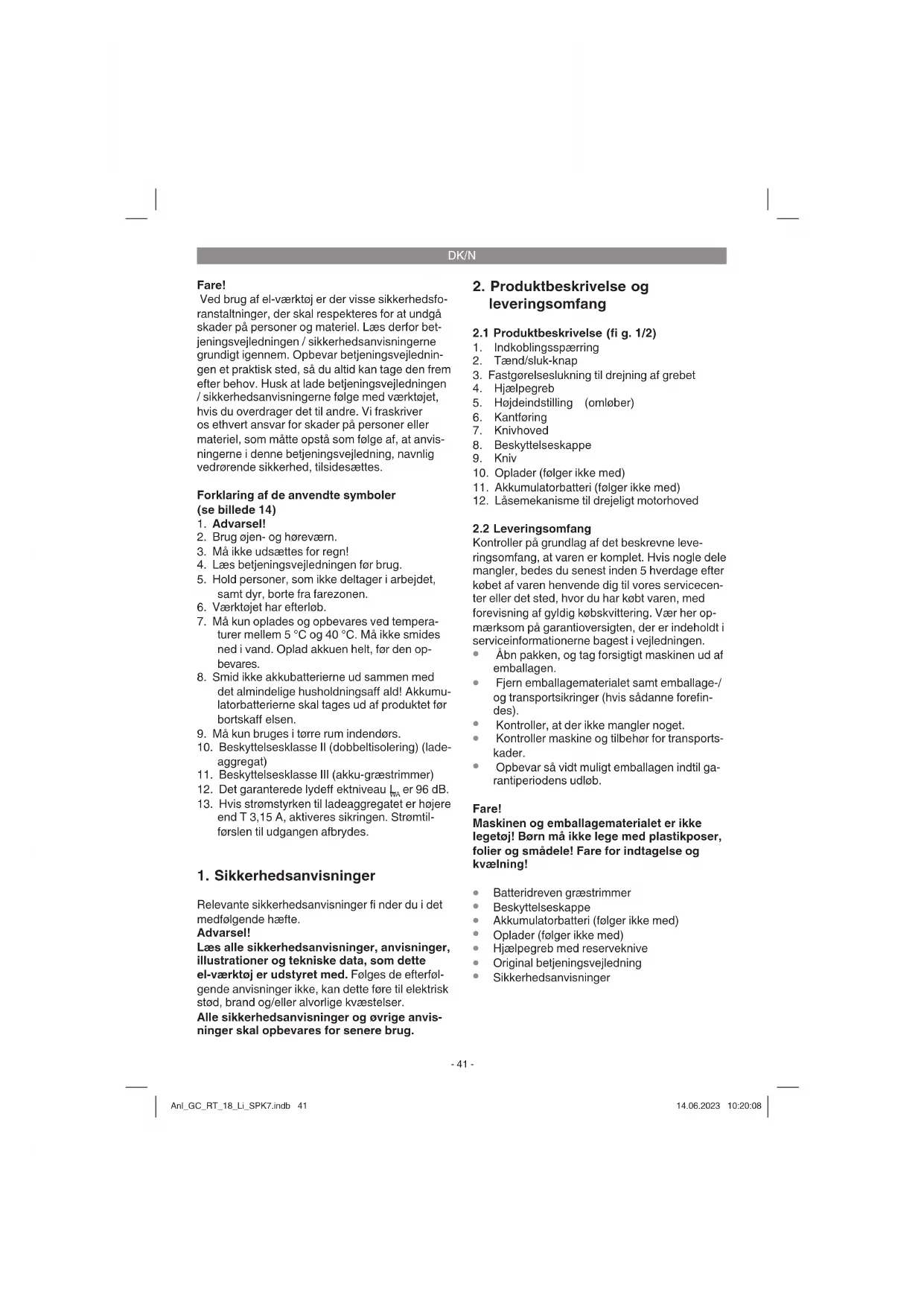 Produktet kører ikke: Kontroller, om akkumulatorbatteriet er ladet op, og om opladeren fungerer. Hvis produktet ikke fungerer, selv om spænding er til stede, skal du indsende den til den angivne kundeservice. Anl_GC_RT_18_Li_SPK7.indb 45Anl_GC_RT_18_Li_SPK7.indb 45 14.06.2023 10:20:0914.06.2023 10:20:09DK/N