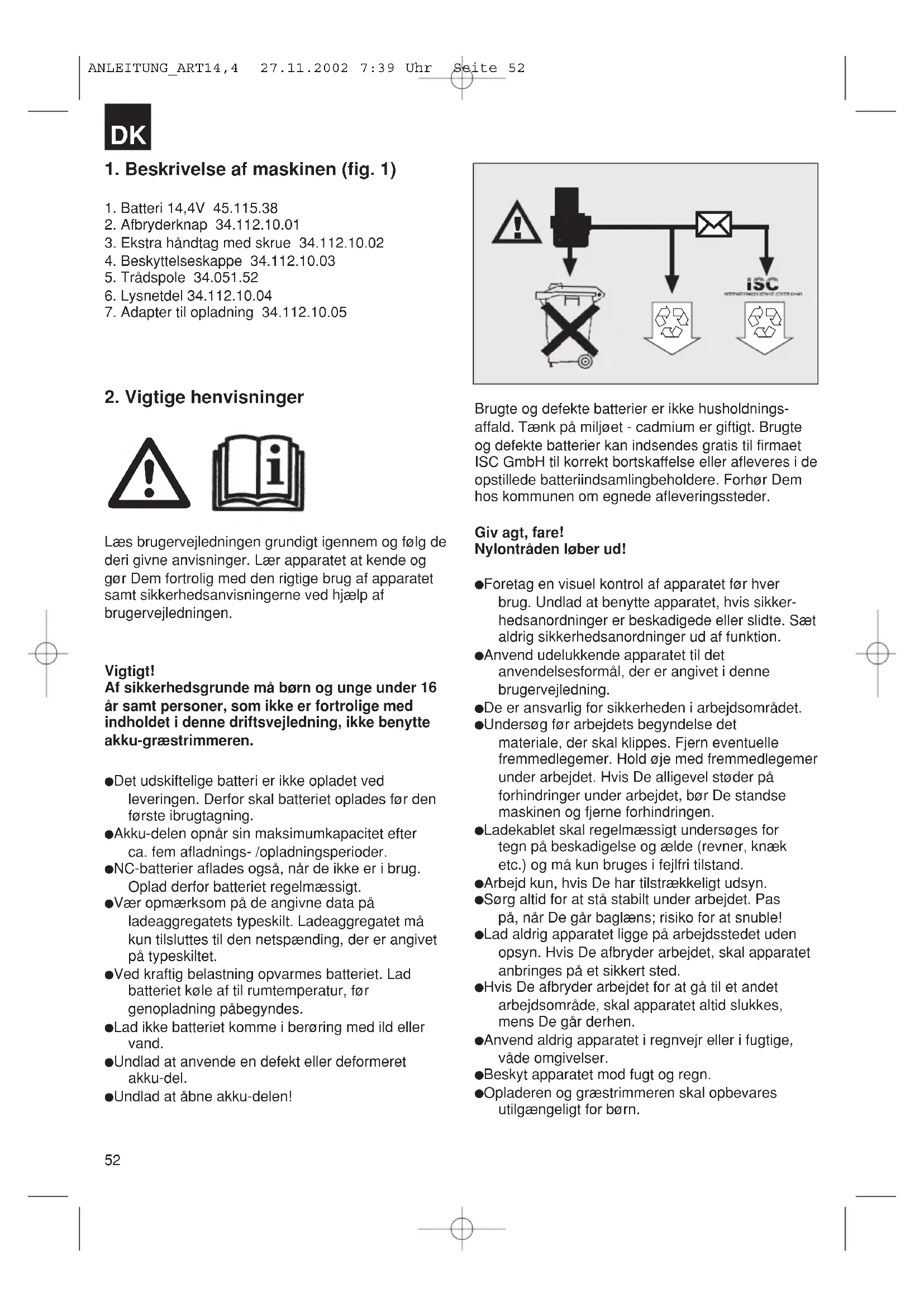 ANLEITUNG_ART14,4 27.11.2002 7:39 Uhr Seite 5152 1. Beskrivelse af maskinen (fig. 1)1. Batteri 14,4V 45.115.382. Afbryderknap 34.112.10.013. Ekstra håndtag med skrue 34.112.10.024. Beskyttelseskappe 34.112.10.035. Trådspole 34.051.526. Lysnetdel 34.112.10.047. Adapter til opladning 34.112.10.052. Vigtige henvisninger Læs brugervejledningen grundigt igennem og følg dederi givne anvisninger. Lær apparatet at kende oggør Dem fortrolig med den rigtige brug af apparatetsamt sikkerhedsanvisningerne ved hjælp afbrugervejledningen.Vigtigt!Af sikkerhedsgrunde må børn og unge under 16år samt personer, som ikke er fortrolige medindholdet i denne driftsvejledning, ikke benytteakku-græstrimmeren. Det udskiftelige batteri er ikke opladet ved leveringen. Derfor skal batteriet oplades før den første ibrugtagning. Akku-delen opnår sin maksimumkapacitet efter ca. fem afladnings- /opladningsperioder. NC-batterier aflades også, når de ikke er i brug. Oplad derfor batteriet regelmæssigt. Vær opmærksom på de angivne data på ladeaggregatets typeskilt. Ladeaggregatet må kun tilsluttes til den netspænding, der er angivet på typeskiltet. Ved kraftig belastning opvarmes batteriet. Lad batteriet køle af til rumtemperatur, før genopladning påbegyndes. Lad ikke batteriet komme i berøring med ild eller vand. Undlad at anvende en defekt eller deformeret akku-del. Undlad at åbne akku-delen!Brugte og defekte batterier er ikke husholdnings-affald. Tænk på miljøet - cadmium er giftigt. Brugteog defekte batterier kan indsendes gratis til firmaetISC GmbH til korrekt bortskaffelse eller afleveres i deopstillede batteriindsamlingbeholdere. Forhør Demhos kommunen om egnede afleveringssteder.Giv agt, fare!Nylontråden løber ud! Foretag en visuel kontrol af apparatet før hver brug. Undlad at benytte apparatet, hvis sikker-hedsanordninger er beskadigede eller slidte. Sætaldrig sikkerhedsanordninger ud af funktion. Anvend udelukkende apparatet til det anvendelsesformål, der er angivet i denne brugervejledning. De er ansvarlig for sikkerheden i arbejdsområdet. Undersøg før arbejdets begyndelse det materiale, der skal klippes. Fjern eventuelle fremmedlegemer. Hold øje med fremmedlegemerunder arbejdet. Hvis De alligevel støder på forhindringer under arbejdet, bør De standse maskinen og fjerne forhindringen. Ladekablet skal regelmæssigt undersøges for tegn på beskadigelse og ælde (revner, knæk etc.) og må kun bruges i fejlfri tilstand. Arbejd kun, hvis De har tilstrækkeligt udsyn. Sørg altid for at stå stabilt under arbejdet. Pas på, når De går baglæns; risiko for at snuble! Lad aldrig apparatet ligge på arbejdsstedet uden opsyn. Hvis De afbryder arbejdet, skal apparatet anbringes på et sikkert sted. Hvis De afbryder arbejdet for at gå til et andet arbejdsområde, skal apparatet altid slukkes, mens De går derhen. Anvend aldrig apparatet i regnvejr eller i fugtige, våde omgivelser. Beskyt apparatet mod fugt og regn. Opladeren og græstrimmeren skal opbevares utilgængeligt for børn.