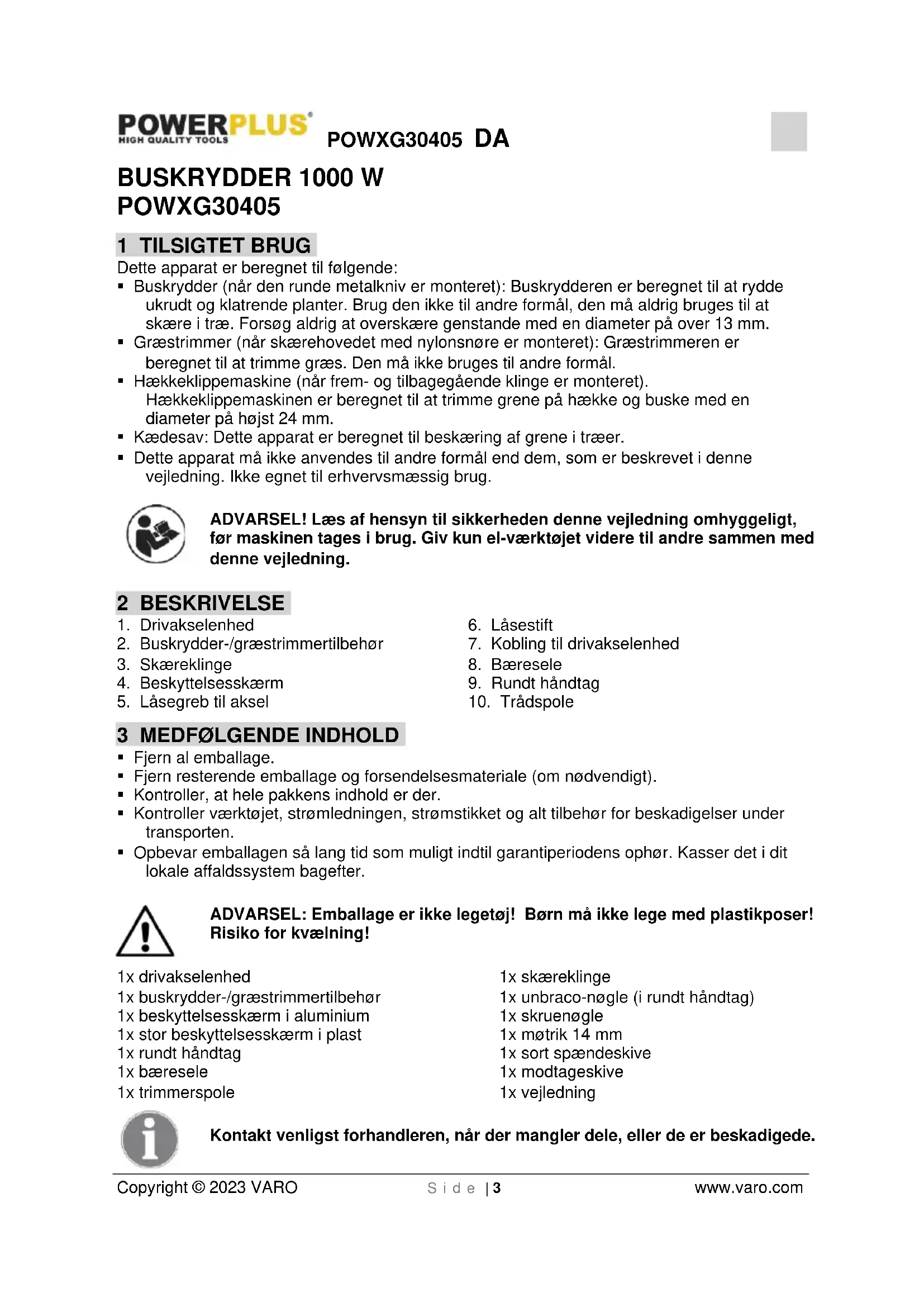 - Brug ikke enheden til at skære vild vækst eller småkratt.POWXG30405 DA Copyright © 2023 VARO S i d e | 10 www.varo.com