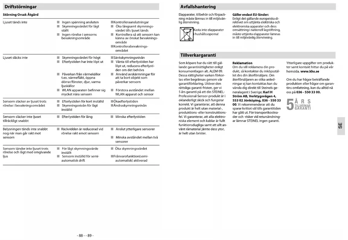 Værdi for grundlysstyrke Ved at trykke på de pågældende knapper, > 5 s, ændres værdien for lysstyrken i trin á 10 % til: 1 = 10 %, 2 = 20 %, ... 6 = 60% Dæmpning via knap Når en knap er tilsluttet til S- klemmen, kan belysningen dæm- pes ved at trykke på knappen. Knappen regulerer først til maksi- mumværdien og vender derefter tilbage til minimumværdien. Hvis knappen slippes, bevares den på- gældende værdi uden yderligere regulering indtil slukning. Derefter befinder sensoren sig i den tidligere indstillede sensor- drift. Retningen for lysdæmpningen (maks./min.) kan ændres ved kort at slippe knappen og derefter tryk- ke på den igen.- 98 - - 99 - Producentgaranti Som køber har du de lovbestemte rettigheder over for sælger. Såfremt disse rettigheder eksiste-rer i dit land, hverken afkortes eller begrænses de af vores garan-tierklæring. Vi giver 5 års garanti for fejlfri og korrekt funktion på dit STEINEL-Professional-sensortek-nologi-produkt. Vi garanterer, at dette produkt ikke har materiale-, produktions- eller konstruktions-fejl. Vi giver garanti for alle elektro-niske komponenters og kablers funktionsevne og for, at alle an-vendte materialer og disses over-flader ikke har mangler. Fremsættelse af kravHvis du vil fremsætte en reklama-tion over dit produkt, bedes du sende produktet komplet og fragtfrit med den originale købs-dokumentation, som skal inde- holde købsdato og produktbeteg-nelse, til din forhandler Roliba A/S, Reklamationsafdelingen, Hvidkærvej 52, DK-5250 Oden-se SV. Vi anbefaler, at du opbeva-rer din købsdokumentation sik-kert, indtil garantiperioden er udløbet. Roliba A/S hæfter ikke for transportomkostninger og risici under returneringen af produktet.Du finder informationer om gennemførelse af et garantikrav på vores hjemmeside www.roliba.dkHvis du har et garantitilfælde eller et spørgsmål til dit produkt, kan du altid ringe på tlf. (+45) 6593 0357. Driftsforstyrrelser Fejl Årsag AfhjælpningLampen tænder ikkeL Ingen tilslutningsspændingL Lux-værdi indstillet for lavtL Ingen bevægelses- registreringL Kontroller tilslutnings- spændingenL Øg lux-værdien langsomt indtil lyset tændesL Sørg for at der er frit udsyn til sensorenL Kontroller overvågnings- områdetLampen slukker ikkeL Lux-værdi for højL Efterløbstiden udløberL Forstyrrende varmekilder f.eks.: Varmeblæsere, åbne døre og vinduer, husdyr, elpærer/halogenpærer, genstande der bevæger sigL WLAN-enhed placeret meget tæt på sensorenL Indstil en lavere lux-værdiL Afvent efterløbstiden, indstil eventuelt en kortere efterløbstidL Afdæk stationære støjkilder med en mærkatL Øg afstanden mellem WLAN-enheden og sensorenSensoren slukker trods tilstedeværelseL Efterløbstiden er for kortL Lystærskel for lavL Øg efterløbstidenL Ændr skumringsindstillingenSensor slukker for sent L Efterløbstiden er for lang L Reducer efterløbstiden Sensoren tænder for sent ved frontal bevægelsesretningL Rækkevidden ved frontal be-vægelsesretning er reduceretL Monter yderligere sensorerL Reducer afstanden mellem to sensorerSensoren tænder ikke ved tilste-deværelse selv om det er mørktL For lav lux-værdi er valgt L Er sensor deaktiveret med kontakt/tast ?L Halvautomatisk ?L Øg lysstyrkegrænsen