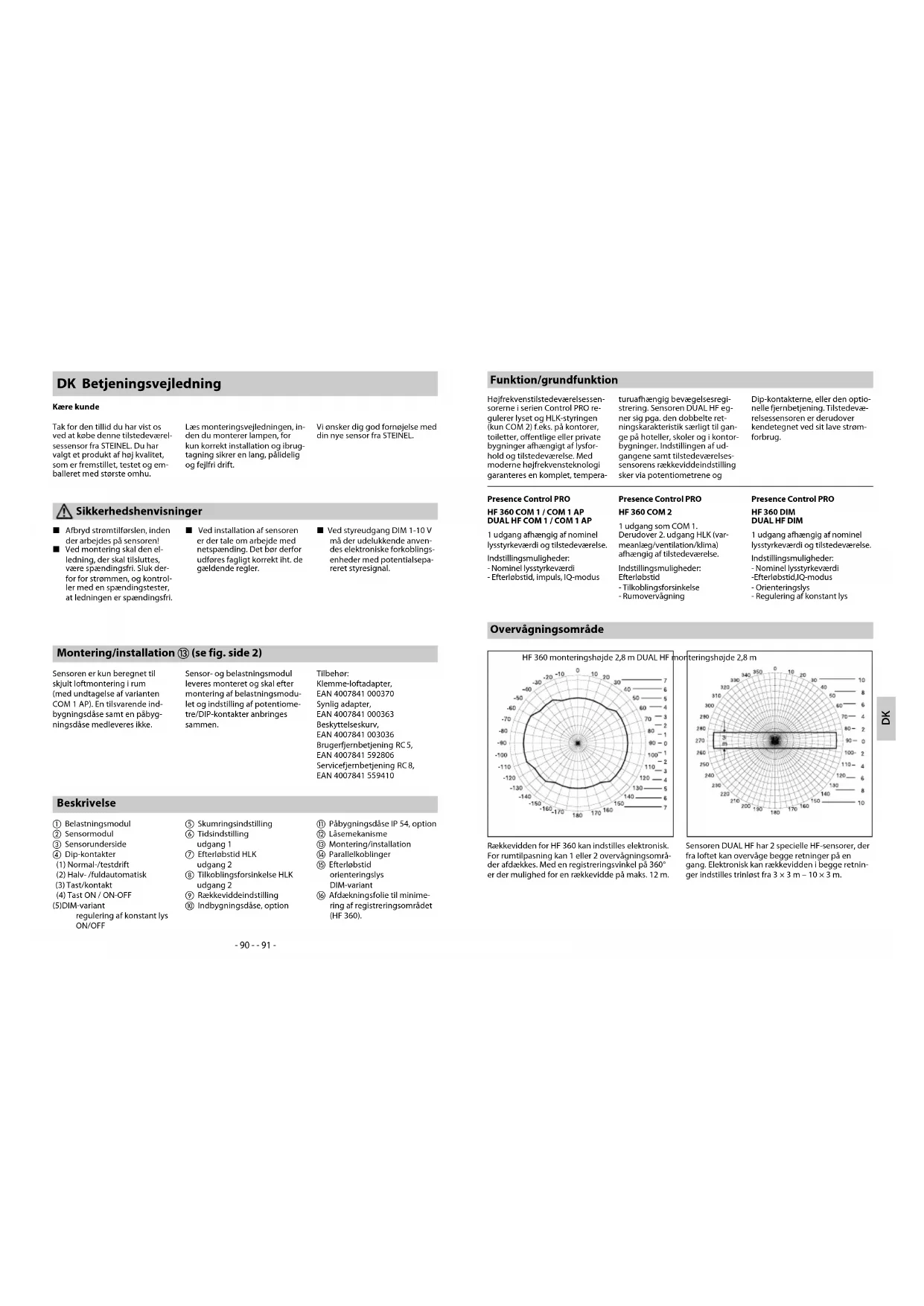 L Afbryd strømtilførslen, inden der arbejdes på sensoren! L Ved montering skal den el- ledning, der skal tilsluttes, være spændingsfri. Sluk der- for for strømmen, og kontrol- ler med en spændingstester, at ledningen er spændingsfri. L Ved installation af sensoren er der tale om arbejde med netspænding. Det bør derfor udføres fagligt korrekt iht. de gældende regler. L Ved styreudgang DIM 1-10 V må der udelukkende anven- des elektroniske forkoblings- enheder med potentialsepa- reret styresignal. Beskrivelse a Belastningsmodul b Sensormodul c Sensorunderside d Dip-kontakter (1) Normal-/testdrift (2) Halv- /fuldautomatisk (3) Tast/kontakt (4) Tast ON / ON-OFF (5) DIM-variant regulering af konstant lys ON/OFF e Skumringsindstilling f Tidsindstilling udgang 1 g Efterløbstid HLK udgang 2 h Tilkoblingsforsinkelse HLK udgang 2 i Rækkeviddeindstilling j Indbygningsdåse, option k Påbygningsdåse IP 54, option l Låsemekanisme m Montering/installation n Parallelkoblinger o Efterløbstid orienteringslys DIM-variant p Afdækningsfolie til minime- ring af registreringsområdet (HF 360). Montering/installation m (se fig. side 2) Sensoren er kun beregnet til skjult loftmontering i rum (med undtagelse af varianten COM 1 AP). En tilsvarende ind- bygningsdåse samt en påbyg- ningsdåse medleveres ikke. Sensor- og belastningsmodul leveres monteret og skal efter montering af belastningsmodu- let og indstilling af potentiome- tre/DIP-kontakter anbringes sammen. Tilbehør: Klemme-loftadapter, EAN 4007841 000370 Synlig adapter, EAN 4007841 000363 Beskyttelseskurv, EAN 4007841 003036 Brugerfjernbetjening RC 5, EAN 4007841 592806 Servicefjernbetjening RC 8, EAN 4007841 559410 DK Betjeningsvejledning Kære kunde Tak for den tillid du har vist os ved at købe denne tilstedeværel- sessensor fra STEINEL. Du har valgt et produkt af høj kvalitet, som er fremstillet, testet og em- balleret med største omhu. Læs monteringsvejledningen, in- den du monterer lampen, for kun korrekt installation og ibrug- tagning sikrer en lang, pålidelig og fejlfri drift. Vi ønsker dig god fornøjelse med din nye sensor fra STEINEL. Sikkerhedshenvisninger Funktion/grundfunktion Højfrekvenstilstedeværelsessen- sorerne i serien Control PRO re- gulerer lyset og HLK-styringen (kun COM 2) f.eks. på kontorer, toiletter, offentlige eller private bygninger afhængigt af lysfor- hold og tilstedeværelse. Med moderne højfrekvensteknologi garanteres en komplet, tempera- turuafhængig bevægelsesregi- strering. Sensoren DUAL HF eg- ner sig pga. den dobbelte ret- ningskarakteristik særligt til gan- ge på hoteller, skoler og i kontor- bygninger. Indstillingen af ud- gangene samt tilstedeværelses- sensorens rækkeviddeindstilling sker via potentiometrene og Dip-kontakterne, eller den optio- nelle fjernbetjening. Tilstedevæ- relsessensoren er derudover kendetegnet ved sit lave strøm- forbrug. Presence Control PRO