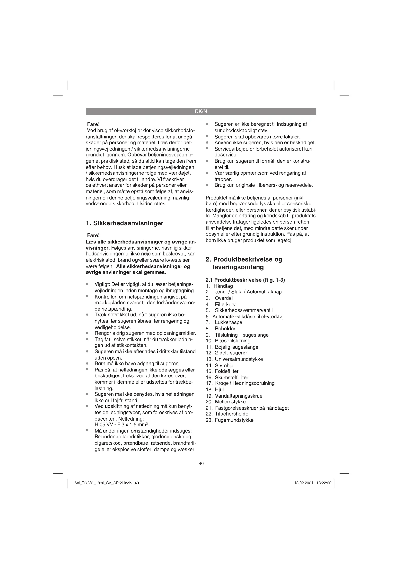 Kun for EU-lande Smid ikke el-værktøj ud som almindeligt husholdningsaff ald! I medfør af Rådets direktiv 2012/19/EF om aff ald af elektrisk og elektronisk udstyr og dettes omsættelse i den nationale lovgivning skal brugt el-værktøj indsamles separat og indleveres til videreanvendende formål på miljømæssig forsvarlig vis. Recycling-alternativ til tilbagesendelse: Ejeren af el-værktøjet er – med mindre denne tilbagesender maskinen – forpligtet til at bortskaff e mas- kinen og dens dele ifølge miljøforskrifterne. Den brugte maskine kan indleveres hos en genbrugsstation – spørg evt. personalet her, eller forhør dig hos din kommune. Tilbehør og hjælpemidler, som følger med maskinen, og som ikke indeholder elektriske dele, er ikke omfattet af ovenstående. Genoptryk eller anden kopiering af dokumentation og følgedokumenter til produkter, også i uddrag, er kun tilladt med udtrykkelig tilladelse fra Einhell Germany AG. Ret til tekniske ændringer forbeholdes Anl_TC-VC_1930_SA_SPK9.indb 44Anl_TC-VC_1930_SA_SPK9.indb 44 18.02.2021 13:22:3718.02.2021 13:22:37DK/N