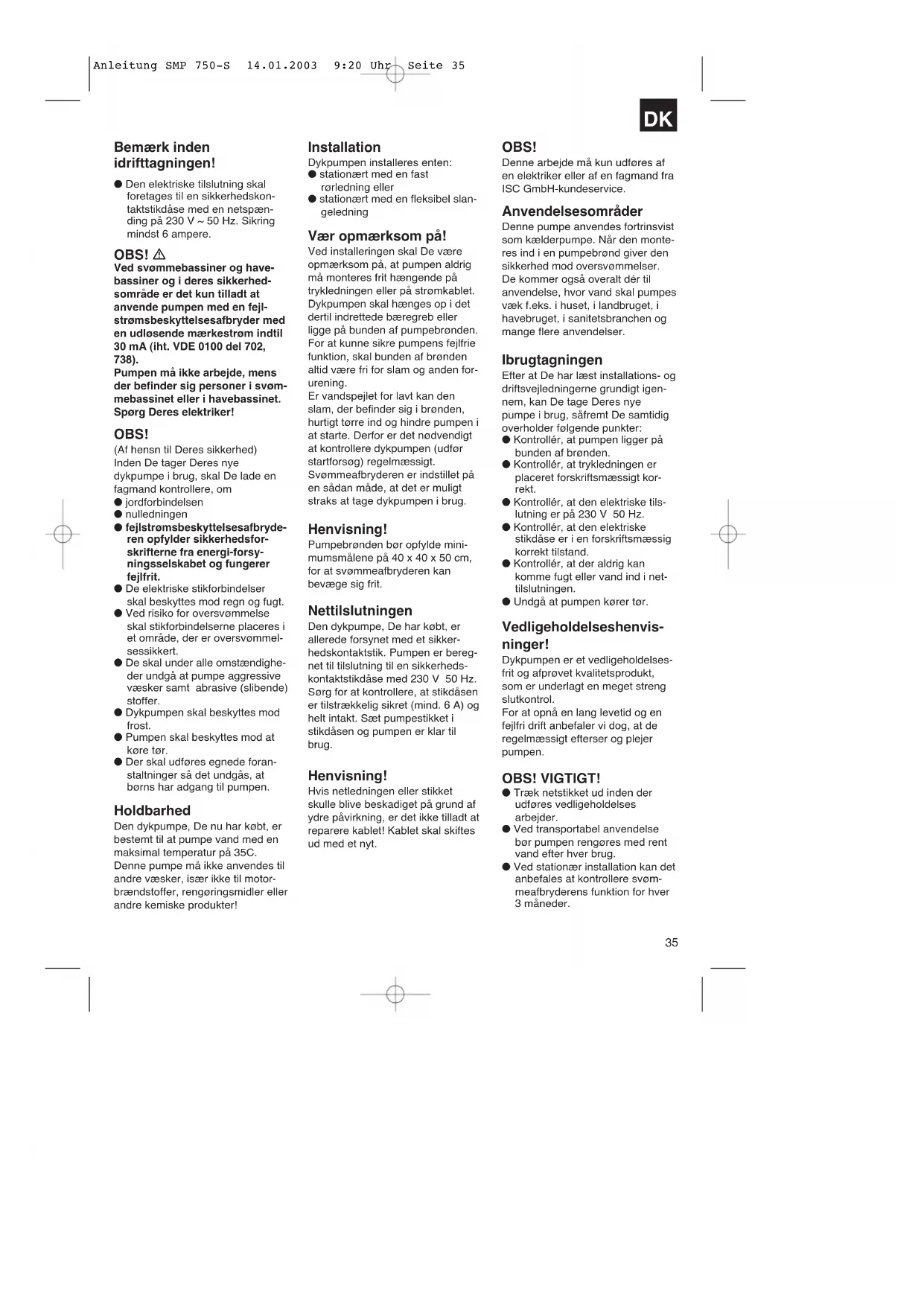 Altezza di mandata 9 m Profondità massima immersione 8 m Temperatura massima acqua 35°C gamento tubo 11/2” IG Corpi estranei fino a Ø 35 mm altezza del punto di commutazione: ACCESO 50 cm altezza del punto di commutazione: SPENTO 5 cm N° dell’art. 41.705.80 Dati tecnici Prestazioni prevalenza portata SMP 750-S 2 m max.: 13.000 l/h 4 m max.: 9.800 l/h 6 m max.: 5.300 l/h Anleitung SMP 750-S 14.01.2003 9:20 Uhr Seite 3435 Bemærk inden idrifttagningen! ● Den elektriske tilslutning skal foretages til en sikkerhedskon- taktstikdåse med en netspæn- ding på 230 V ~ 50 Hz. Sikring mindst 6 ampere. OBS! Ved svømmebassiner og have- bassiner og i deres sikkerhed- sområde er det kun tilladt at anvende pumpen med en fejl- strømsbeskyttelsesafbryder med en udløsende mærkestrøm indtil 30 mA (iht. VDE 0100 del 702, 738). Pumpen må ikke arbejde, mens der befinder sig personer i svøm- mebassinet eller i havebassinet. Spørg Deres elektriker! OBS! (Af hensn til Deres sikkerhed) Inden De tager Deres nye dykpumpe i brug, skal De lade en fagmand kontrollere, om ● jordforbindelsen ● nulledningen ● fejlstrømsbeskyttelsesafbryde- ren opfylder sikkerhedsfor- skrifterne fra energi-forsy- ningsselskabet og fungerer fejlfrit. ● De elektriske stikforbindelser skal beskyttes mod regn og fugt. ● Ved risiko for oversvømmelse skal stikforbindelserne placeres i et område, der er oversvømmel- sessikkert. ● De skal under alle omstændighe- der undgå at pumpe aggressive væsker samt abrasive (slibende) stoffer. ● Dykpumpen skal beskyttes mod frost. ● Pumpen skal beskyttes mod at køre tør. ● Der skal udføres egnede foran- staltninger så det undgås, at børns har adgang til pumpen. Holdbarhed Den dykpumpe, De nu har købt, er bestemt til at pumpe vand med en maksimal temperatur på 35C. Denne pumpe må ikke anvendes til andre væsker, især ikke til motor- brændstoffer, rengøringsmidler eller andre kemiske produkter! OBS! Denne arbejde må kun udføres af en elektriker eller af en fagmand fra ISC GmbH-kundeservice. Anvendelsesområder Denne pumpe anvendes fortrinsvist som kælderpumpe. Når den monte- res ind i en pumpebrønd giver den sikkerhed mod oversvømmelser. De kommer også overalt dér til anvendelse, hvor vand skal pumpes væk f.eks. i huset, i landbruget, i havebruget, i sanitetsbranchen og mange flere anvendelser. Ibrugtagningen Efter at De har læst installations- og driftsvejledningerne grundigt igen- nem, kan De tage Deres nye pumpe i brug, såfremt De samtidig overholder følgende punkter: ● Kontrollér, at pumpen ligger på bunden af brønden. ● Kontrollér, at trykledningen er placeret forskriftsmæssigt kor- rekt. ● Kontrollér, at den elektriske tils- lutning er på 230 V 50 Hz. ● Kontrollér, at den elektriske stikdåse er i en forskriftsmæssig korrekt tilstand. ● Kontrollér, at der aldrig kan komme fugt eller vand ind i net- tilslutningen. ● Undgå at pumpen kører tør. Vedligeholdelseshenvis- ninger! Dykpumpen er et vedligeholdelses- frit og afprøvet kvalitetsprodukt, som er underlagt en meget streng slutkontrol. For at opnå en lang levetid og en fejlfri drift anbefaler vi dog, at de regelmæssigt efterser og plejer pumpen. OBS! VIGTIGT! ● Træk netstikket ud inden der udføres vedligeholdelses arbejder. ● Ved transportabel anvendelse bør pumpen rengøres med rent vand efter hver brug. ● Ved stationær installation kan det anbefales at kontrollere svøm- meafbryderens funktion for hver 3 måneder. Installation Dykpumpen installeres enten: ● stationært med en fast rørledning eller ● stationært med en fleksibel slan- geledning Vær opmærksom på! Ved installeringen skal De være opmærksom på, at pumpen aldrig må monteres frit hængende på trykledningen eller på strømkablet. Dykpumpen skal hænges op i det dertil indrettede bæregreb eller ligge på bunden af pumpebrønden. For at kunne sikre pumpens fejlfrie funktion, skal bunden af brønden altid være fri for slam og anden for- urening. Er vandspejlet for lavt kan den slam, der befinder sig i brønden, hurtigt tørre ind og hindre pumpen i at starte. Derfor er det nødvendigt at kontrollere dykpumpen (udfør startforsøg) regelmæssigt. Svømmeafbryderen er indstillet på en sådan måde, at det er muligt straks at tage dykpumpen i brug. Henvisning! Pumpebrønden bør opfylde mini- mumsmålene på 40 x 40 x 50 cm, for at svømmeafbryderen kan bevæge sig frit. Nettilslutningen Den dykpumpe, De har købt, er allerede forsynet med et sikker- hedskontaktstik. Pumpen er bereg- net til tilslutning til en sikkerheds- kontaktstikdåse med 230 V 50 Hz. Sørg for at kontrollere, at stikdåsen er tilstrækkelig sikret (mind. 6 A) og helt intakt. Sæt pumpestikket i stikdåsen og pumpen er klar til brug. Henvisning! Hvis netledningen eller stikket skulle blive beskadiget på grund af ydre påvirkning, er det ikke tilladt at reparere kablet! Kablet skal skiftes ud med et nyt.