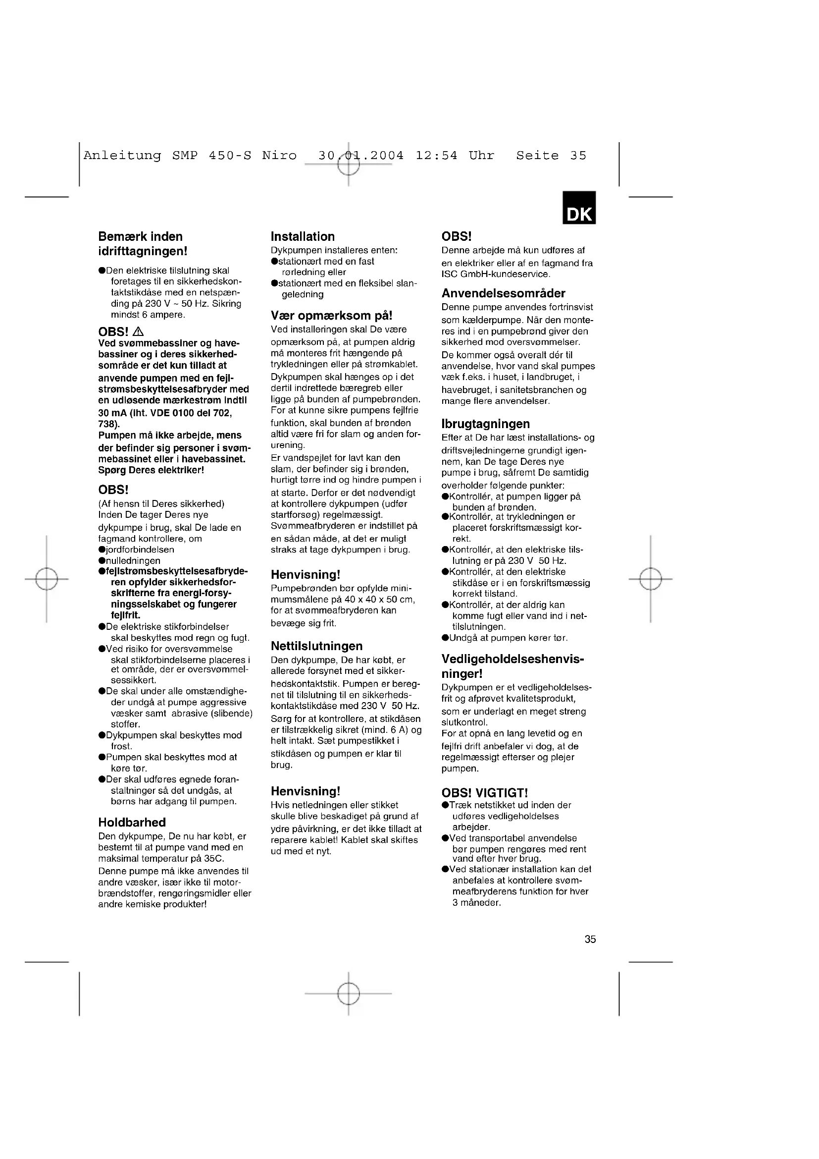 Altezza di mandata 7 m Profondità massima immersione 5 m Temperatura massima acqua 35°C gamento tubo 1 1/4” AG Corpi estranei fino a Ø 25 mm altezza del punto di commutazione: ACCESO 50 cmaltezza del punto di commutazione: SPENTO 5 cm N° dell’art. 41.703.30 Dati tecnici Prestazioni prevalenza portata SMP 450/1-S NIRO 1m max.: 8.000 l/h 2m max.: 6.600 l/h 3m max.: 5.400 l/h 4m max.: 4.000 l/h 5m max.: 2.700 l/h 6m max.: 1.200 l/h Anleitung SMP 450-S Niro 30.01.2004 12:54 Uhr Seite 3435 Bemærk inden idrifttagningen! ● Den elektriske tilslutning skal foretages til en sikkerhedskon- taktstikdåse med en netspæn- ding på 230 V ~ 50 Hz. Sikring mindst 6 ampere. OBS! Ved svømmebassiner og have- bassiner og i deres sikkerhed- sområde er det kun tilladt at anvende pumpen med en fejl- strømsbeskyttelsesafbryder med en udløsende mærkestrøm indtil 30 mA (iht. VDE 0100 del 702, 738). Pumpen må ikke arbejde, mens der befinder sig personer i svøm- mebassinet eller i havebassinet. Spørg Deres elektriker! OBS! (Af hensn til Deres sikkerhed) Inden De tager Deres nye dykpumpe i brug, skal De lade en fagmand kontrollere, om ● jordforbindelsen ● nulledningen ● fejlstrømsbeskyttelsesafbryde- ren opfylder sikkerhedsfor- skrifterne fra energi-forsy- ningsselskabet og fungerer fejlfrit. ● De elektriske stikforbindelser skal beskyttes mod regn og fugt. ● Ved risiko for oversvømmelse skal stikforbindelserne placeres i et område, der er oversvømmel- sessikkert. ● De skal under alle omstændighe- der undgå at pumpe aggressive væsker samt abrasive (slibende) stoffer. ● Dykpumpen skal beskyttes mod frost. ● Pumpen skal beskyttes mod at køre tør. ● Der skal udføres egnede foran- staltninger så det undgås, at børns har adgang til pumpen. Holdbarhed Den dykpumpe, De nu har købt, er bestemt til at pumpe vand med en maksimal temperatur på 35C. Denne pumpe må ikke anvendes til andre væsker, især ikke til motor- brændstoffer, rengøringsmidler eller andre kemiske produkter! OBS! Denne arbejde må kun udføres af en elektriker eller af en fagmand fra ISC GmbH-kundeservice. Anvendelsesområder Denne pumpe anvendes fortrinsvist som kælderpumpe. Når den monte- res ind i en pumpebrønd giver den sikkerhed mod oversvømmelser. De kommer også overalt dér til anvendelse, hvor vand skal pumpes væk f.eks. i huset, i landbruget, i havebruget, i sanitetsbranchen og mange flere anvendelser. Ibrugtagningen Efter at De har læst installations- og driftsvejledningerne grundigt igen- nem, kan De tage Deres nye pumpe i brug, såfremt De samtidig overholder følgende punkter: ● Kontrollér, at pumpen ligger på bunden af brønden. ● Kontrollér, at trykledningen er placeret forskriftsmæssigt kor- rekt. ● Kontrollér, at den elektriske tils- lutning er på 230 V 50 Hz. ● Kontrollér, at den elektriske stikdåse er i en forskriftsmæssig korrekt tilstand. ● Kontrollér, at der aldrig kan komme fugt eller vand ind i net- tilslutningen. ● Undgå at pumpen kører tør. Vedligeholdelseshenvis- ninger! Dykpumpen er et vedligeholdelses- frit og afprøvet kvalitetsprodukt, som er underlagt en meget streng slutkontrol. For at opnå en lang levetid og en fejlfri drift anbefaler vi dog, at de regelmæssigt efterser og plejer pumpen. OBS! VIGTIGT! ● Træk netstikket ud inden der udføres vedligeholdelses arbejder. ● Ved transportabel anvendelse bør pumpen rengøres med rent vand efter hver brug. ● Ved stationær installation kan det anbefales at kontrollere svøm- meafbryderens funktion for hver 3 måneder. Installation Dykpumpen installeres enten: ● stationært med en fast rørledning eller ● stationært med en fleksibel slan- geledning Vær opmærksom på! Ved installeringen skal De være opmærksom på, at pumpen aldrig må monteres frit hængende på trykledningen eller på strømkablet. Dykpumpen skal hænges op i det dertil indrettede bæregreb eller ligge på bunden af pumpebrønden. For at kunne sikre pumpens fejlfrie funktion, skal bunden af brønden altid være fri for slam og anden for- urening. Er vandspejlet for lavt kan den slam, der befinder sig i brønden, hurtigt tørre ind og hindre pumpen i at starte. Derfor er det nødvendigt at kontrollere dykpumpen (udfør startforsøg) regelmæssigt. Svømmeafbryderen er indstillet på en sådan måde, at det er muligt straks at tage dykpumpen i brug. Henvisning! Pumpebrønden bør opfylde mini- mumsmålene på 40 x 40 x 50 cm, for at svømmeafbryderen kan bevæge sig frit. Nettilslutningen Den dykpumpe, De har købt, er allerede forsynet med et sikker- hedskontaktstik. Pumpen er bereg- net til tilslutning til en sikkerheds- kontaktstikdåse med 230 V 50 Hz. Sørg for at kontrollere, at stikdåsen er tilstrækkelig sikret (mind. 6 A) og helt intakt. Sæt pumpestikket i stikdåsen og pumpen er klar til brug. Henvisning! Hvis netledningen eller stikket skulle blive beskadiget på grund af ydre påvirkning, er det ikke tilladt at reparere kablet! Kablet skal skiftes ud med et nyt.