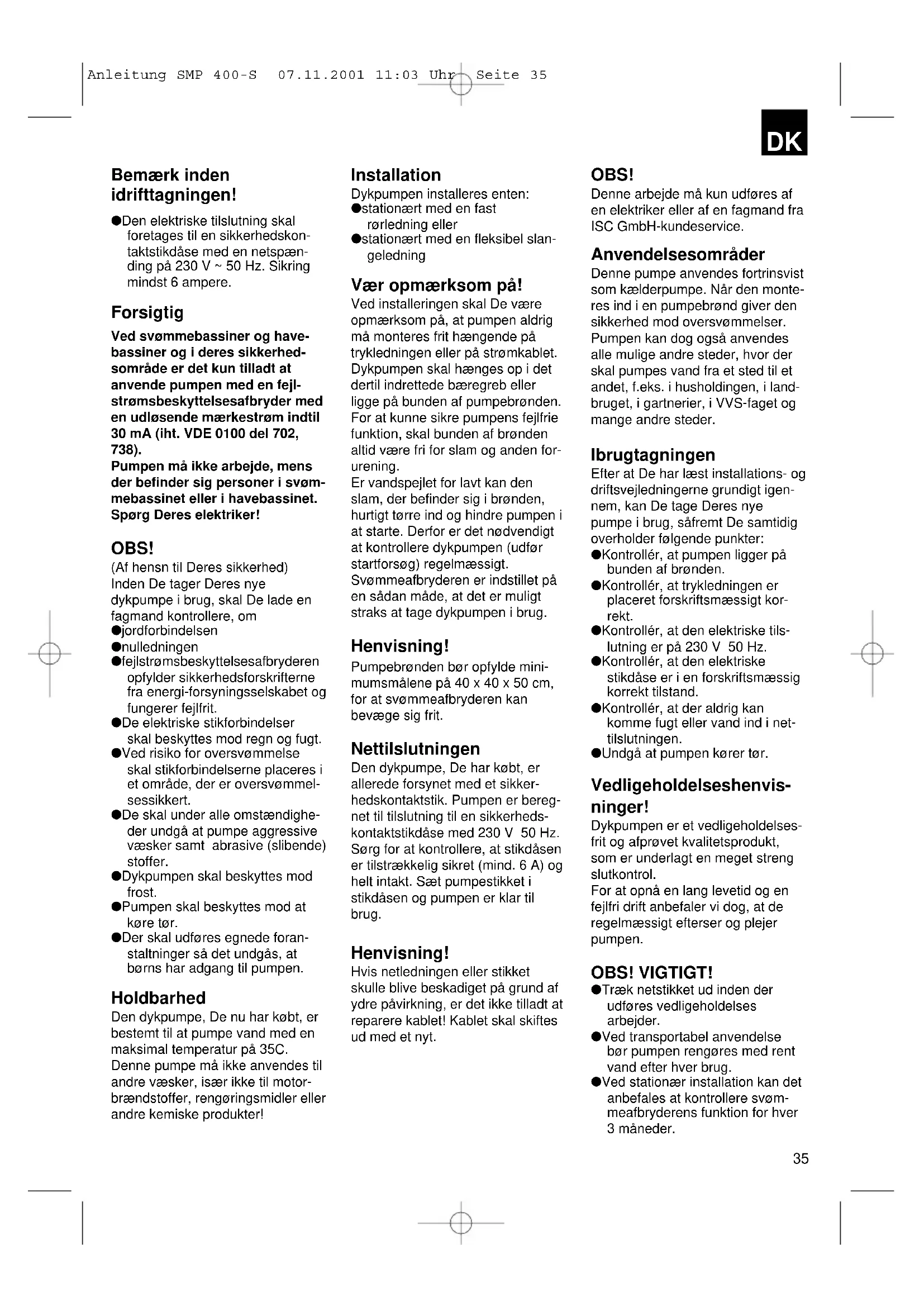 Alimentazione rete 230V ~ 50Hz Potenza assorbita 400 Watt Quantità massima di mandata 9000 l/h. Altezza di mandata 5,5 m Profondità massima immersione 4,5 m Temperatura massima acqua 35°C gamento tubo 5/4” AG Corpi estranei fino a Ø 30mm altezza del punto di commutazione: ACCESO 40 cm altezza del punto di commutazione: SPENTO 15 cm N° dell’art. 41.708.90 Dati tecnici Anleitung SMP 400-S 07.11.2001 11:03 Uhr Seite 3435 Bemærk inden idrifttagningen! ● Den elektriske tilslutning skal foretages til en sikkerhedskon- taktstikdåse med en netspæn- ding på 230 V ~ 50 Hz. Sikring mindst 6 ampere. Forsigtig Ved svømmebassiner og have- bassiner og i deres sikkerhed- sområde er det kun tilladt at anvende pumpen med en fejl- strømsbeskyttelsesafbryder med en udløsende mærkestrøm indtil 30 mA (iht. VDE 0100 del 702, 738). Pumpen må ikke arbejde, mens der befinder sig personer i svøm- mebassinet eller i havebassinet. Spørg Deres elektriker! OBS! (Af hensn til Deres sikkerhed) Inden De tager Deres nye dykpumpe i brug, skal De lade en fagmand kontrollere, om ● jordforbindelsen ● nulledningen ● fejlstrømsbeskyttelsesafbryderen opfylder sikkerhedsforskrifterne fra energi-forsyningsselskabet og fungerer fejlfrit. ● De elektriske stikforbindelser skal beskyttes mod regn og fugt. ● Ved risiko for oversvømmelse skal stikforbindelserne placeres i et område, der er oversvømmel- sessikkert. ● De skal under alle omstændighe- der undgå at pumpe aggressive væsker samt abrasive (slibende) stoffer. ● Dykpumpen skal beskyttes mod frost. ● Pumpen skal beskyttes mod at køre tør. ● Der skal udføres egnede foran- staltninger så det undgås, at børns har adgang til pumpen. Holdbarhed Den dykpumpe, De nu har købt, er bestemt til at pumpe vand med en maksimal temperatur på 35C. Denne pumpe må ikke anvendes til andre væsker, især ikke til motor- brændstoffer, rengøringsmidler eller andre kemiske produkter! OBS! Denne arbejde må kun udføres af en elektriker eller af en fagmand fra ISC GmbH-kundeservice. Anvendelsesområder Denne pumpe anvendes fortrinsvist som kælderpumpe. Når den monte- res ind i en pumpebrønd giver den sikkerhed mod oversvømmelser. Pumpen kan dog også anvendes alle mulige andre steder, hvor der skal pumpes vand fra et sted til et andet, f.eks. i husholdingen, i land- bruget, i gartnerier, i VVS-faget og mange andre steder. Ibrugtagningen Efter at De har læst installations- og driftsvejledningerne grundigt igen- nem, kan De tage Deres nye pumpe i brug, såfremt De samtidig overholder følgende punkter: ● Kontrollér, at pumpen ligger på bunden af brønden. ● Kontrollér, at trykledningen er placeret forskriftsmæssigt kor- rekt. ● Kontrollér, at den elektriske tils- lutning er på 230 V 50 Hz. ● Kontrollér, at den elektriske stikdåse er i en forskriftsmæssig korrekt tilstand. ● Kontrollér, at der aldrig kan komme fugt eller vand ind i net- tilslutningen. ● Undgå at pumpen kører tør. Vedligeholdelseshenvis- ninger! Dykpumpen er et vedligeholdelses- frit og afprøvet kvalitetsprodukt, som er underlagt en meget streng slutkontrol. For at opnå en lang levetid og en fejlfri drift anbefaler vi dog, at de regelmæssigt efterser og plejer pumpen. OBS! VIGTIGT! ● Træk netstikket ud inden der udføres vedligeholdelses arbejder. ● Ved transportabel anvendelse bør pumpen rengøres med rent vand efter hver brug. ● Ved stationær installation kan det anbefales at kontrollere svøm- meafbryderens funktion for hver 3 måneder. Installation Dykpumpen installeres enten: ● stationært med en fast rørledning eller ● stationært med en fleksibel slan- geledning Vær opmærksom på! Ved installeringen skal De være opmærksom på, at pumpen aldrig må monteres frit hængende på trykledningen eller på strømkablet. Dykpumpen skal hænges op i det dertil indrettede bæregreb eller ligge på bunden af pumpebrønden. For at kunne sikre pumpens fejlfrie funktion, skal bunden af brønden altid være fri for slam og anden for- urening. Er vandspejlet for lavt kan den slam, der befinder sig i brønden, hurtigt tørre ind og hindre pumpen i at starte. Derfor er det nødvendigt at kontrollere dykpumpen (udfør startforsøg) regelmæssigt. Svømmeafbryderen er indstillet på en sådan måde, at det er muligt straks at tage dykpumpen i brug. Henvisning! Pumpebrønden bør opfylde mini- mumsmålene på 40 x 40 x 50 cm, for at svømmeafbryderen kan bevæge sig frit. Nettilslutningen Den dykpumpe, De har købt, er allerede forsynet med et sikker- hedskontaktstik. Pumpen er bereg- net til tilslutning til en sikkerheds- kontaktstikdåse med 230 V 50 Hz. Sørg for at kontrollere, at stikdåsen er tilstrækkelig sikret (mind. 6 A) og helt intakt. Sæt pumpestikket i stikdåsen og pumpen er klar til brug. Henvisning! Hvis netledningen eller stikket skulle blive beskadiget på grund af ydre påvirkning, er det ikke tilladt at reparere kablet! Kablet skal skiftes ud med et nyt.