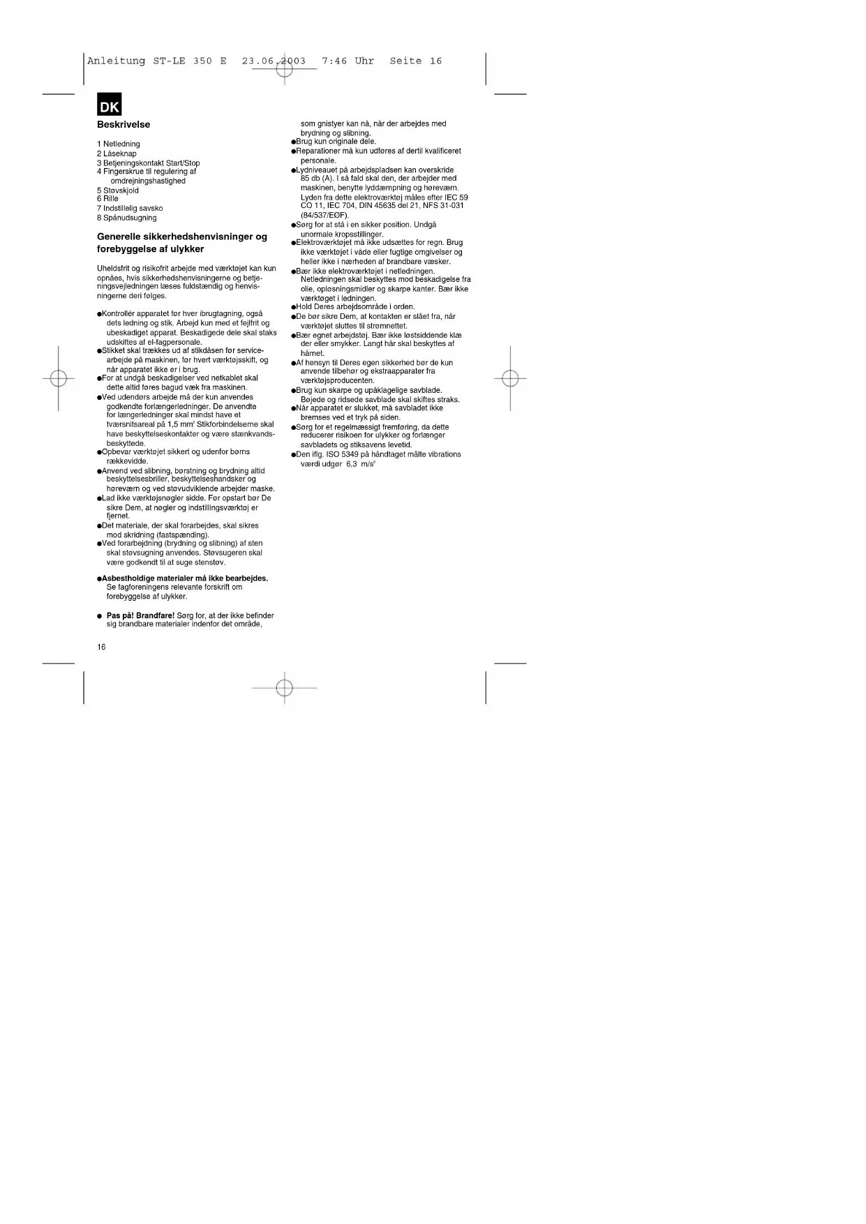 Ficksnitt: Bara i spånpalttor och trä utan förborrning. Tryck sticksågen dikt an mot motstycket och rör den långsamt i sågriktningen. Sågning av laminerade spånplattor 1.Använd fint sågblad 2.Sätt fotplattan mot det obelagda stället 3.Mata med liten kraft Motstycke ●●Använd alltid ordentliga ochpassande sågblad●●Starta endast sticksåget dåett sågblad finns monterat●●Olja stödrullen med ett pardroppar olja då och då Anleitung ST-LE 350 E 23.06.2003 7:46 Uhr Seite 1516 Beskrivelse 1 Netledning 2 Låseknap 3 Betjeningskontakt Start/Stop 4 Fingerskrue til regulering af omdrejningshastighed 5 Støvskjold 6 Rille 7 Indstillelig savsko 8 Spånudsugning Generelle sikkerhedshenvisninger og forebyggelse af ulykker Uheldsfrit og risikofrit arbejde med værktøjet kan kun opnåes, hvis sikkerhedshenvisningerne og betje- ningsvejledningen læses fuldstændig og henvis- ningerne deri følges. Kontrollér apparatet før hver ibrugtagning, også dets ledning og stik. Arbejd kun med et fejlfrit og ubeskadiget apparat. Beskadigede dele skal staks udskiftes af el-fagpersonale. Stikket skal trækkes ud af stikdåsen før service- arbejde på maskinen, før hvert værktøjsskift, og når apparatet ikke er i brug. For at undgå beskadigelser ved netkablet skal dette altid føres bagud væk fra maskinen. Ved udendørs arbejde må der kun anvendes godkendte forlængerledninger. De anvendte for længerledninger skal mindst have et tværsnitsareal på 1,5 mm