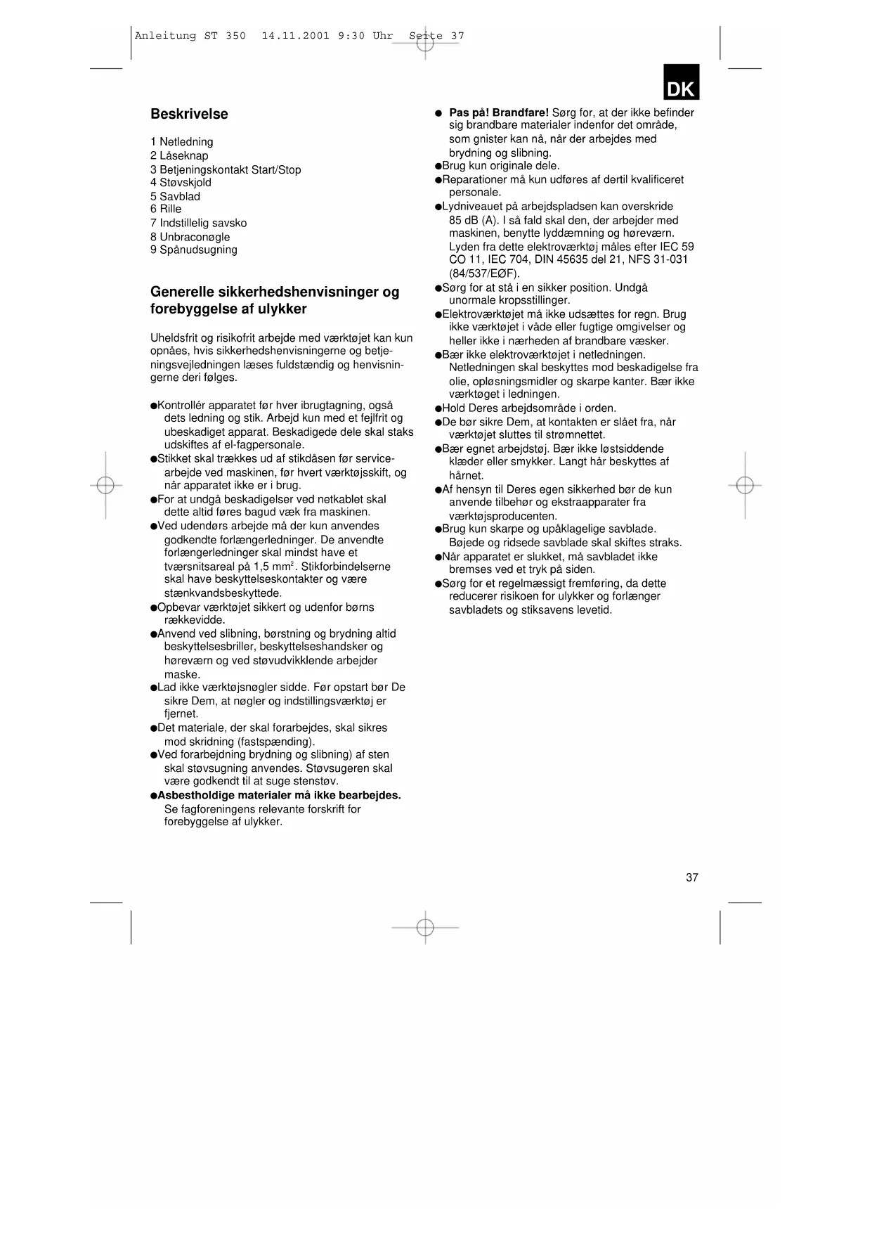 Anleitung ST 350 14.11.2001 9:30 Uhr Seite 3738 Betjeningsvejledning til elektronisk stiksav ST 350 IDRIFTTAGNING Kort kørsel (figur 3) Start: Betjeningskontakten trykkes ned Stop: Slip betjeningskontakten Konstant kørsel Start: Betjeningskontakten trykkes ned og fæstnes i nedtrykket tilstand med låseknappen. Stop: Betjeningskontakten trykkes ned og løsnes. Skift af savblad (figur 2) Stiksaven skal slukkes og stikket trækkes ud før alle servicearbejder og savbladsskift. Begge skruer ved stødstangen (figur 2) løsnes med den vedlagte unbraconøgle. Savbladet skubbes ind i rillen mellem hævestang og holdebøjle til anslag. Begge skruer fæstnes med den vedlagte unbra- conøgle. Savbladets tænder skal vise i skæreret- ningen. Sørg for, at savbladet sidder i stødstangens og løberullens rille. Ændring af savskoens position (spidssnit og savning nær rande, figur 5) Savskoen kan vippes til geringssnit og skråsnit indtil ca. 45 grader på begge sider ved at løsne begge skruer på undersiden. Vinklerne er markeret med streger for 15, 30 og 45 grader. En indstilling mellem markeringerne er uden videre mulig. For at ændre snitvinklen løsner De begge skruer (figur 5) så meget, at savskoen netop kan rykkes. Indstil den ønskede vinkel og skru skruerne fast igen. Når der skal saves til randen kan savskoen skubbes bagud. Hertil løsnes begge skruer på undersiden (figur 5) og savskoen skubbes bagud. Skru derefter begge skruer fast igen. Støvsugning Stiksaven er udstyret med en støvsugertilslutning. Enhver støvsuger kan sluttes til udsugningsåbningen ved stiksavens bagende. Sæt Dem venligst i forbin- delse med producenten af Deres støvsuger, hvis De behøver en særlig adapter hertil. TEKNISKE DATA Driftsspænding 230 v ~ 50 Hz Optagen effekt 350 W Slagtal max. 3000/min. Slaglængde 18 mm Skæredybde træ 55 mm Skæredybde kunststof 10 mm Skæredybde jern 6 mm Geringssnit Indtil 45° (venstre og højre) Lydtryksniveau LPA89 db (A) Lydeffektniveau LWA99,6 db (A)