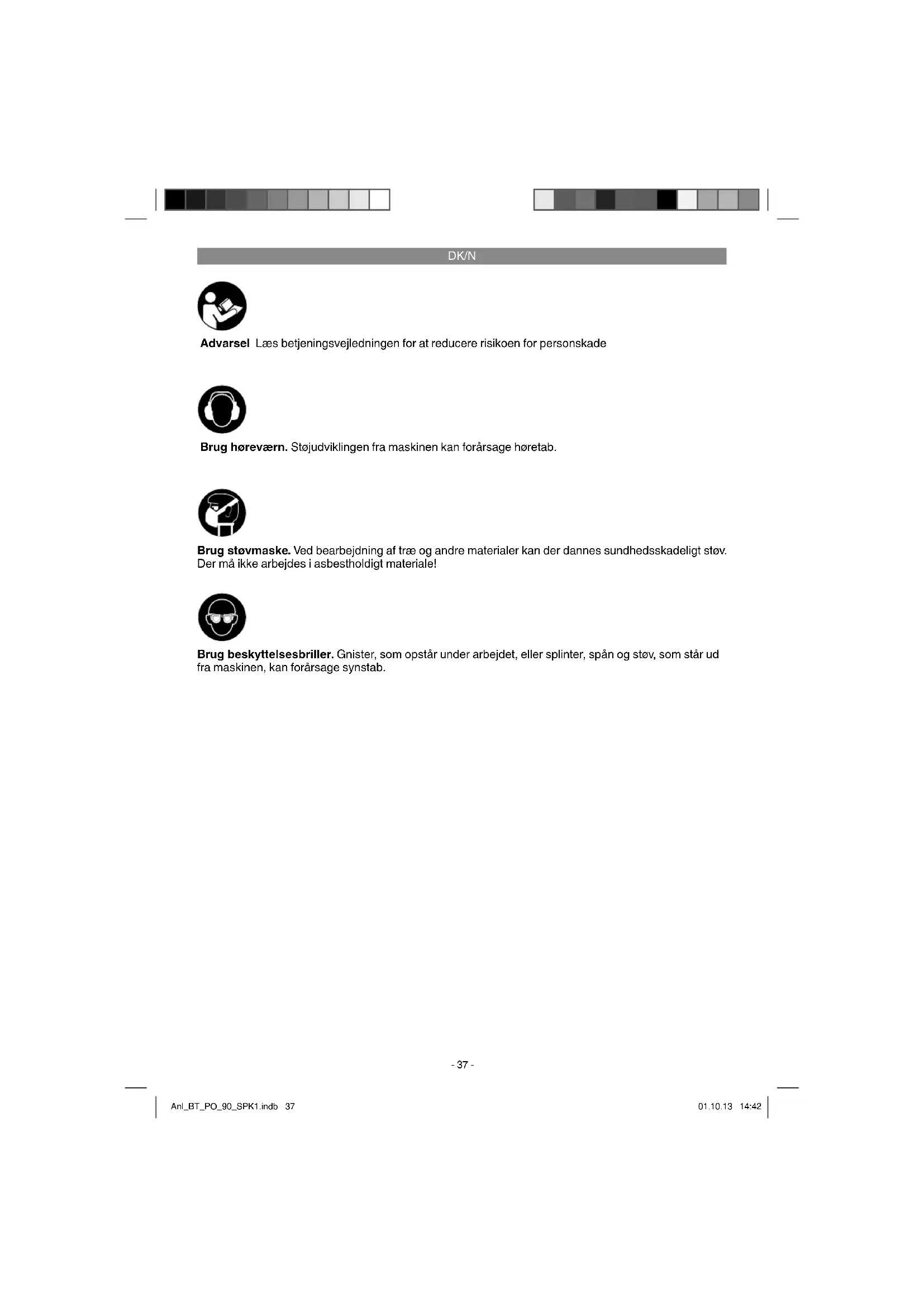 Advarsel Læs betjeningsvejledningen for at reducere risikoen for personskade Brug høreværn. Støjudviklingen fra maskinen kan forårsage høretab. Brug beskyttelsesbriller. Gnister, som opstår under arbejdet, eller splinter, spån og støv, som står ud fra maskinen, kan forårsage synstab. Brug støvmaske. Ved bearbejdning af træ og andre materialer kan der dannes sundhedsskadeligt støv. Der må ikke arbejdes i asbestholdigt materiale! Anl_BT_PO_90_SPK1.indb 37Anl_BT_PO_90_SPK1.indb 37 01.10.13 14:4201.10.13 14:42DK/N