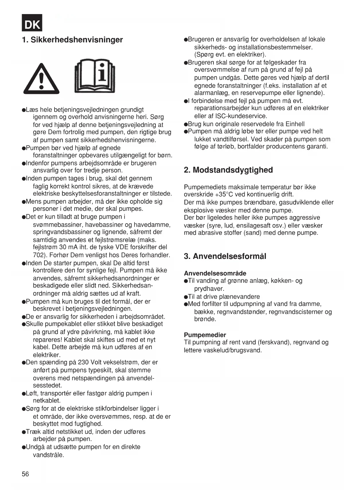 Læs hele betjeningsvejledningen grundigt igennem og overhold anvisningerne heri. Sørg for ved hjælp af denne betjeningsvejledning at gøre Dem fortrolig med pumpen, den rigtige brug af pumpen samt sikkerhedshenvisningerne. Pumpen bør ved hjælp af egnede foranstaltninger opbevares utilgængeligt for børn. Indenfor pumpens arbejdsområde er brugeren ansvarlig over for tredje person. Inden pumpen tages i brug, skal det gennem faglig korrekt kontrol sikres, at de krævede elektriske beskyttelsesforanstaltninger er tilstede. Mens pumpen arbejder, må der ikke opholde sig personer i det medie, der skal pumpes. Det er kun tilladt at bruge pumpen i svømmebassiner, havebassiner og havedamme, springvandsbassiner og lignende, såfremt der samtidig anvendes et fejlstrømsrelæ (maks. fejlstrøm 30 mA iht. de tyske VDE forskrifter del 702). Forhør Dem venligst hos Deres forhandler. Inden De starter pumpen, skal De altid først kontrollere den for synlige fejl. Pumpen må ikke anvendes, såfremt sikkerhedsanordninger er beskadigede eller slidt ned. Sikkerhedsan- ordninger må aldrig sættes ud af kraft. Pumpen må kun bruges til det formål, der er beskrevet i betjeningsvejledningen. De er ansvarlig for sikkerheden i arbejdsområdet. Skulle pumpekablet eller stikket blive beskadiget på grund af ydre påvirkning, må kablet ikke repareres! Kablet skal skiftes ud med et nyt kabel. Dette arbejde må kun udføres af en elektriker. Den spænding på 230 Volt vekselstrøm, der er anført på pumpens typeskilt, skal stemme overens med netspændingen på anvendel- sesstedet. Løft, transportér eller fastgør aldrig pumpen i netkablet. Sørg for at de elektriske stikforbindelser ligger i et område, der ikke oversvømmes, resp. at de er beskyttet mod fugtighed. Træk altid netstikket ud, inden der udføres arbejder på pumpen. Undgå at udsætte pumpen for en direkte vandstråle. Brugeren er ansvarlig for overholdelsen af lokale sikkerheds- og installationsbestemmelser. (Spørg evt. en elektriker). Brugeren skal sørge for at følgeskader fra oversvømmelse af rum på grund af fejl på pumpen undgås. Dette gøres ved hjælp af dertil egnede foranstaltninger (f.eks. installation af et alarmanlæg, en reservepumpe eller lignende). I forbindelse med fejl på pumpen må evt. reparationsarbejder kun udføres af en elektriker eller af ISC-kundeservice. Brug kun originale reservedele fra Einhell Pumpen må aldrig løbe tør eller pumpe ved helt lukket vandtilførsel. Ved skader på pumpen som følge af tørløb, bortfalder producentens garanti.