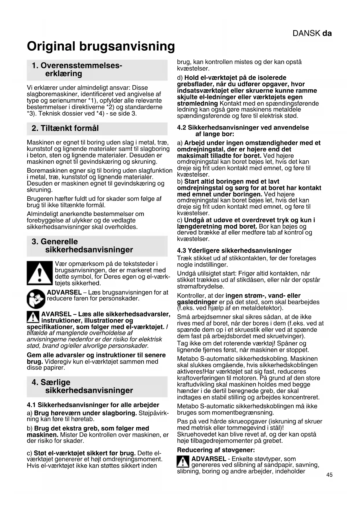 Træk stikket ud af stikkontakten, før der foretages nogle indstillinger. Undgå utilsigtet start: Frigør altid kontakten, når stikket trækkes ud af stikdåsen, eller når der opstår strømafbrydelse. Kontroller, at der ingen strøm-, vand- eller gasledninger er på det sted, som skal bearbejdes (f.eks. ved hjælp af en metaldetektor). Små arbejdsemner skal sikres sådan, at de ikke rives med af boret, når der bores i dem (f.eks. ved at spænde dem op i et skruestik eller ved at spænde dem fast på arbejdsbordet med skruetvinger). Tag ikke om det roterende værktøj! Spåner og lignende fjernes først, når maskinen er stoppet. Metabo S-automatic sikkerhedskobling. Maskinen skal slukkes omgående, hvis sikkerhedskoblingen aktiveres!Har værktøjet sat sig fast, reduceres kraftoverføringen til motoren. På grund af den store kraftudvikling skal maskinen holdes med begge hænder i de dertil beregnede greb, der skal indtages en stabil stilling og arbejdes koncentreret. Metabo S-automatic sikkerhedskoblingen må ikke bruges som momentbegrænsning. Pas på ved hårde skrueopgaver (iskruning af skruer med metrisk eller tommegevind i stål)! Skruehovedet kan blive revet af, og der kan opstå høje tilbagedrejemomenter på grebet. Reducering af støvgener: ADVARSEL - Enkelte støvtyper, som genereres ved slibning af sandpapir, savning, slibning, boring og andre arbejder, indeholder