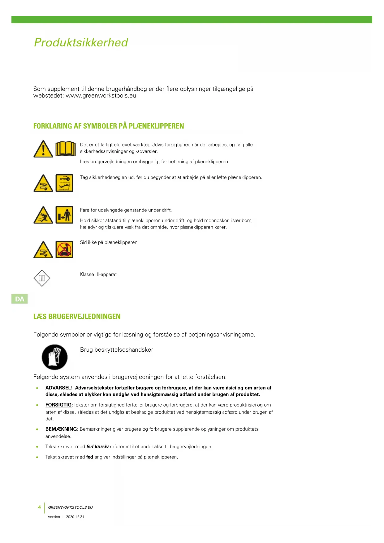 Det er et farligt eldrevet værktøj. Udvis forsigtighed når der arbejdes, og følg alle sikkerhedsanvisninger og -advarsler. Læs brugervejledningen omhyggeligt før betjening af plæneklipperen. Tag sikkerhedsnøglen ud, før du begynder at at arbejde på eller løfte plæneklipperen. Fare for udslyngede genstande under drift. Hold sikker afstand til plæneklipperen under drift, og hold mennesker, især børn, kæledyr og tilskuere væk fra det område, hvor plæneklipperen kører. Sid ikke på plæneklipperen. Klasse III-apparat Som supplement til denne brugerhåndbog er der flere oplysninger tilgængelige på webstedet: www.greenworkstools.eu