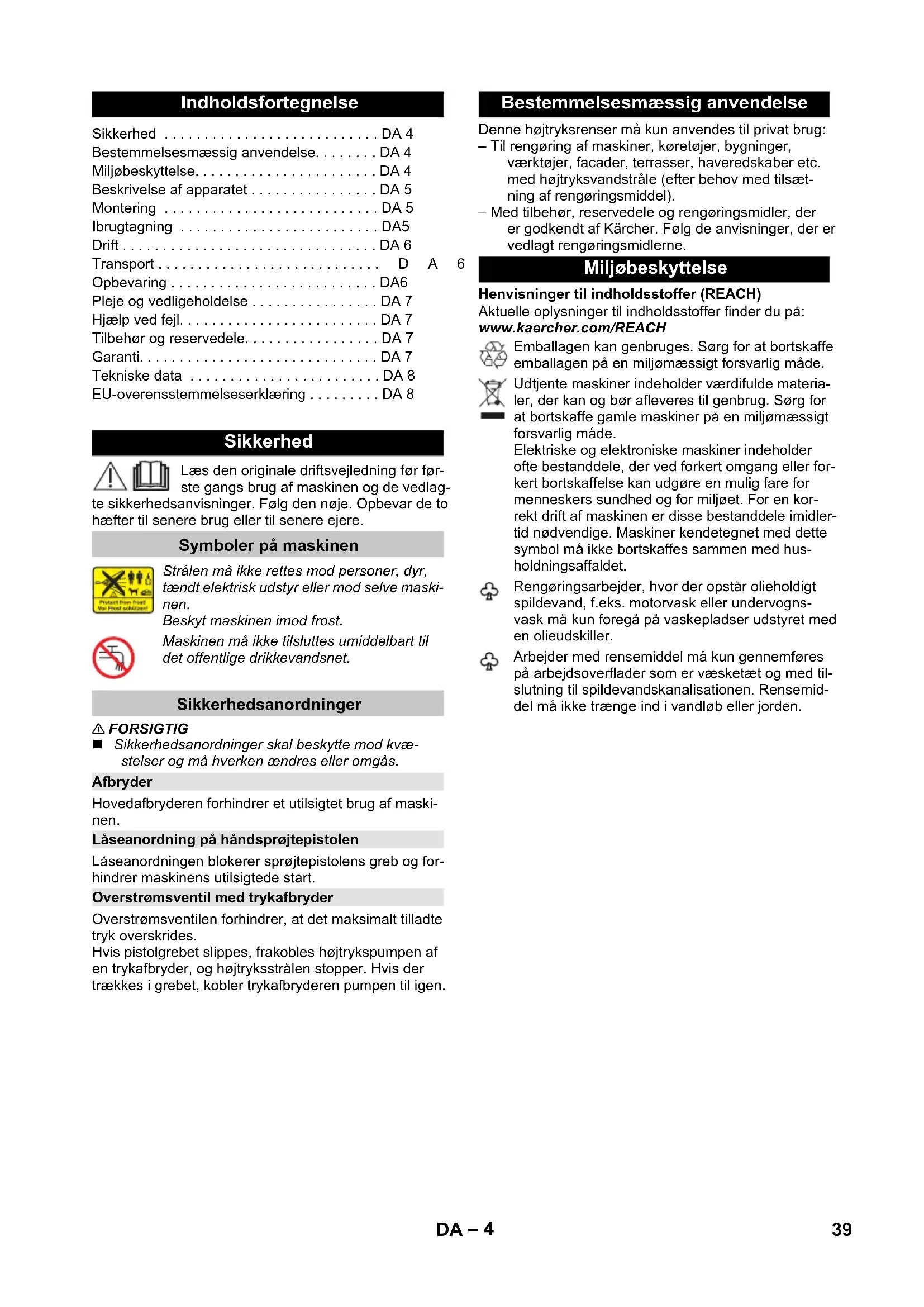 89 dB(A) O fabricante reserva-se o direito de proceder a quaisquer altera- ções técnicas. Declaração UE de conformidade Produto: Lavadora de alta pressão Tipo: KHP 4 Respectivas Directrizes da UE 2000/14/CE 2014/30/UE 2006/42/CE (+2009/127/CE) 2011/65/UE Normas harmonizadas aplicadas EN 50581 EN 55014–1:2017 EN 55014–2: 2015 EN 60335–1 EN 60335–2–79 EN 61000–3–2: 2014 EN 61000–3–3: 2013 EN 62233: 2008 Processo aplicado de avaliação de conformidade 2000/14/CE: Anexo V Nível de potência acústica dB(A) Medido: 87 Garantido: 89 Winnenden, 2018/08/01 Chairman of the Board of Management Director Regulatory Affairs & Certification 38 PT– 4 Læs den originale driftsvejledning før før- ste gangs brug af maskinen og de vedlag- te sikkerhedsanvisninger. Følg den nøje. Opbevar de to hæfter til senere brug eller til senere ejere. 몇 FORSIGTIG Sikkerhedsanordninger skal beskytte mod kvæ- stelser og må hverken ændres eller omgås. Hovedafbryderen forhindrer et utilsigtet brug af maski- nen. Låseanordningen blokerer sprøjtepistolens greb og for- hindrer maskinens utilsigtede start. Overstrømsventilen forhindrer, at det maksimalt tilladte tryk overskrides. Hvis pistolgrebet slippes, frakobles højtrykspumpen af en trykafbryder, og højtryksstrålen stopper. Hvis der trækkes i grebet, kobler trykafbryderen pumpen til igen. Denne højtryksrenser må kun anvendes til privat brug: – Til rengøring af maskiner, køretøjer, bygninger, værktøjer, facader, terrasser, haveredskaber etc. med højtryksvandstråle (efter behov med tilsæt- ning af rengøringsmiddel). – Med tilbehør, reservedele og rengøringsmidler, der er godkendt af Kärcher. Følg de anvisninger, der er vedlagt rengøringsmidlerne. Henvisninger til indholdsstoffer (REACH) Aktuelle oplysninger til indholdsstoffer finder du på: www.kaercher.com/REACH Indholdsfortegnelse Sikkerhed . . . . . . . . . . . . . . . . . . . . . . . . . . . DA 4 Bestemmelsesmæssig anvendelse. . . . . . . . DA 4 Miljøbeskyttelse. . . . . . . . . . . . . . . . . . . . . . . DA 4 Beskrivelse af apparatet . . . . . . . . . . . . . . . . DA 5 Montering . . . . . . . . . . . . . . . . . . . . . . . . . . . DA 5 Ibrugtagning . . . . . . . . . . . . . . . . . . . . . . . . . DA5 Drift . . . . . . . . . . . . . . . . . . . . . . . . . . . . . . . . DA 6 Transport . . . . . . . . . . . . . . . . . . . . . . . . . . . .DA6 Opbevaring . . . . . . . . . . . . . . . . . . . . . . . . . . DA6 Pleje og vedligeholdelse . . . . . . . . . . . . . . . . DA 7 Hjælp ved fejl. . . . . . . . . . . . . . . . . . . . . . . . . DA 7 Tilbehør og reservedele. . . . . . . . . . . . . . . . . DA 7 Garanti. . . . . . . . . . . . . . . . . . . . . . . . . . . . . . DA 7 Tekniske data . . . . . . . . . . . . . . . . . . . . . . . . DA 8 EU-overensstemmelseserklæring . . . . . . . . . DA 8 Sikkerhed Symboler på maskinen Strålen må ikke rettes mod personer, dyr, tændt elektrisk udstyr eller mod selve maski- nen. Beskyt maskinen imod frost. Maskinen må ikke tilsluttes umiddelbart til det offentlige drikkevandsnet. Sikkerhedsanordninger Afbryder Låseanordning på håndsprøjtepistolen Overstrømsventil med trykafbryder Bestemmelsesmæssig anvendelse Miljøbeskyttelse Emballagen kan genbruges. Sørg for at bortskaffe emballagen på en miljømæssigt forsvarlig måde. Udtjente maskiner indeholder værdifulde materia- ler, der kan og bør afleveres til genbrug. Sørg for at bortskaffe gamle maskiner på en miljømæssigt forsvarlig måde. Elektriske og elektroniske maskiner indeholder ofte bestanddele, der ved forkert omgang eller for- kert bortskaffelse kan udgøre en mulig fare for menneskers sundhed og for miljøet. For en kor- rekt drift af maskinen er disse bestanddele imidler- tid nødvendige. Maskiner kendetegnet med dette symbol må ikke bortskaffes sammen med hus- holdningsaffaldet. Rengøringsarbejder, hvor der opstår olieholdigt spildevand, f.eks. motorvask eller undervogns- vask må kun foregå på vaskepladser udstyret med en olieudskiller. Arbejder med rensemiddel må kun gennemføres på arbejdsoverflader som er væsketæt og med til- slutning til spildevandskanalisationen. Rensemid- del må ikke trænge ind i vandløb eller jorden. 39DA– 5 Apparatets leveringsomfang (afhængig af model) vises på emballagen. I denne driftsvejledning beskrives alle optionsmuligheder. Se figurerne på side 2 1 Tilkoblingsdel til vandforsyning 2 Vandtilslutning med integreret si 3 Hovedafbryder „0/OFF“ / „I/ON“ 4 Højtryksslange 5 Højtryks-slangetrommel 6 Opbevaring til håndsprøjtepistolen 7 Transportgreb 8 Håndsving til slangerullen 9 Net til opbevaringsrum 10 Strømledning med netstik 11 Rensemiddeltank 12 Tranporthjul 13 Håndsprøjtepistol 14 Låseanordning på håndsprøjtepistolen 15 Knap til at adskille højtryksslangen fra håndsprøjte- pistolen. 16 Strålerør med rotordyse Til svære tilsmudsinger 17 Strålerør med trykregulering (Vario Power) Til de mest almindelige rengøringsopgaver Arbejdstrykket kan øges trinløst fra "SOFT" til "HARD". Giv slip på højtrykspistolens greb, og drej strålerøret til den ønskede stilling for at justere ar- bejdstrykket. Egnet til arbejde med rensemidler. Løse komponenter, som er vedlagt maskinen, skal før brugen monteres. Se figurerne på side 3 Figur Tryk hjulene ind i holderen. Hjulene sikres med vedlagte propper. Hold øje med proppens orientering! Figur Sæt transporthåndtaget på og skru det fast. Figur Tilslutningsniplen fra den korte højtryksslange tryk- kes ind i messingholderen og sikres med klemmen. Bemærk: Tag hensyn til den rigtige orientering af tilslutningsstykket. Kontroller om forbindelsen er sikker ved at trække i højtryksslangen. Figur Sæt holderen til håndsprøjtepistolen på. Figur Skru den medfølgende koblingsdel på højtryksren- serens vandtilslutning. Figur Skru højtryksslangen ind i håndsprøjtepistolen ind- til det kan høres at den går i hak. Bemær