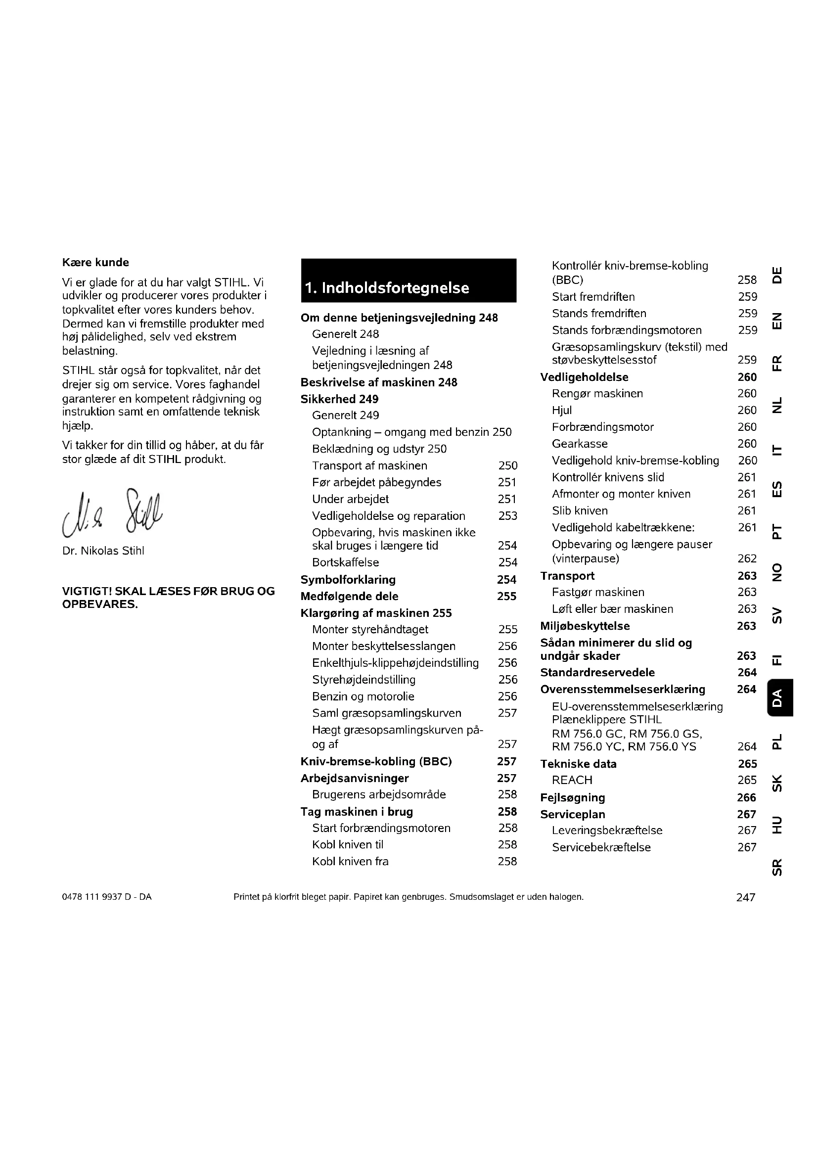 Om denne betjeningsvejledning 248 Generelt 248 Vejledning i læsning af betjeningsvejledningen 248 Beskrivelse af maskinen 248 Sikkerhed 249 Generelt 249 Optankning – omgang med benzin 250 Beklædning og udstyr 250 Transport af maskinen 250 Før arbejdet påbegyndes 251 Under arbejdet 251 Vedligeholdelse og reparation 253 Opbevaring, hvis maskinen ikke skal bruges i længere tid 254 Bortskaffelse 254 Symbolforklaring 254 Medfølgende dele 255 Klargøring af maskinen 255 Monter styrehåndtaget 255 Monter beskyttelsesslangen 256 Enkelthjuls-klippehøjdeindstilling 256 Styrehøjdeindstilling 256 Benzin og motorolie 256 Saml græsopsamlingskurven 257 Hægt græsopsamlingskurven på- og af 257 Kniv-bremse-kobling (BBC) 257 Arbejdsanvisninger 257 Brugerens arbejdsområde 258 Tag maskinen i brug 258 Start forbrændingsmotoren 258 Kobl kniven til 258 Kobl kniven fra 258 Kontrollér kniv-bremse-kobling (BBC) 258 Start fremdriften 259 Stands fremdriften 259 Stands forbrændingsmotoren 259 Græsopsamlingskurv (tekstil) med støvbeskyttelsesstof 259 Vedligeholdelse 260 Rengør maskinen 260 Hjul 260 Forbrændingsmotor 260 Gearkasse 260 Vedligehold kniv-bremse-kobling 260 Kontrollér knivens slid 261 Afmonter og monter kniven 261 Slib kniven 261 Vedligehold kabeltrækkene: 261 Opbevaring og længere pauser (vinterpause) 262 Transport 263 Fastgør maskinen 263 Løft eller bær maskinen 263 Miljøbeskyttelse 263 Sådan minimerer du slid og undgår skader 263 Standardreservedele 264 Overensstemmelseserklæring 264 EU-overensstemmelseserklæring Plæneklippere STIHL RM 756.0 GC, RM 756.0 GS, RM 756.0 YC, RM 756.0 YS 264 Tekniske data 265 REACH 265 Fejlsøgning 266 Serviceplan 267 Leveringsbekræftelse 267 Servicebekræftelse 2670478 111 9937 D - DA