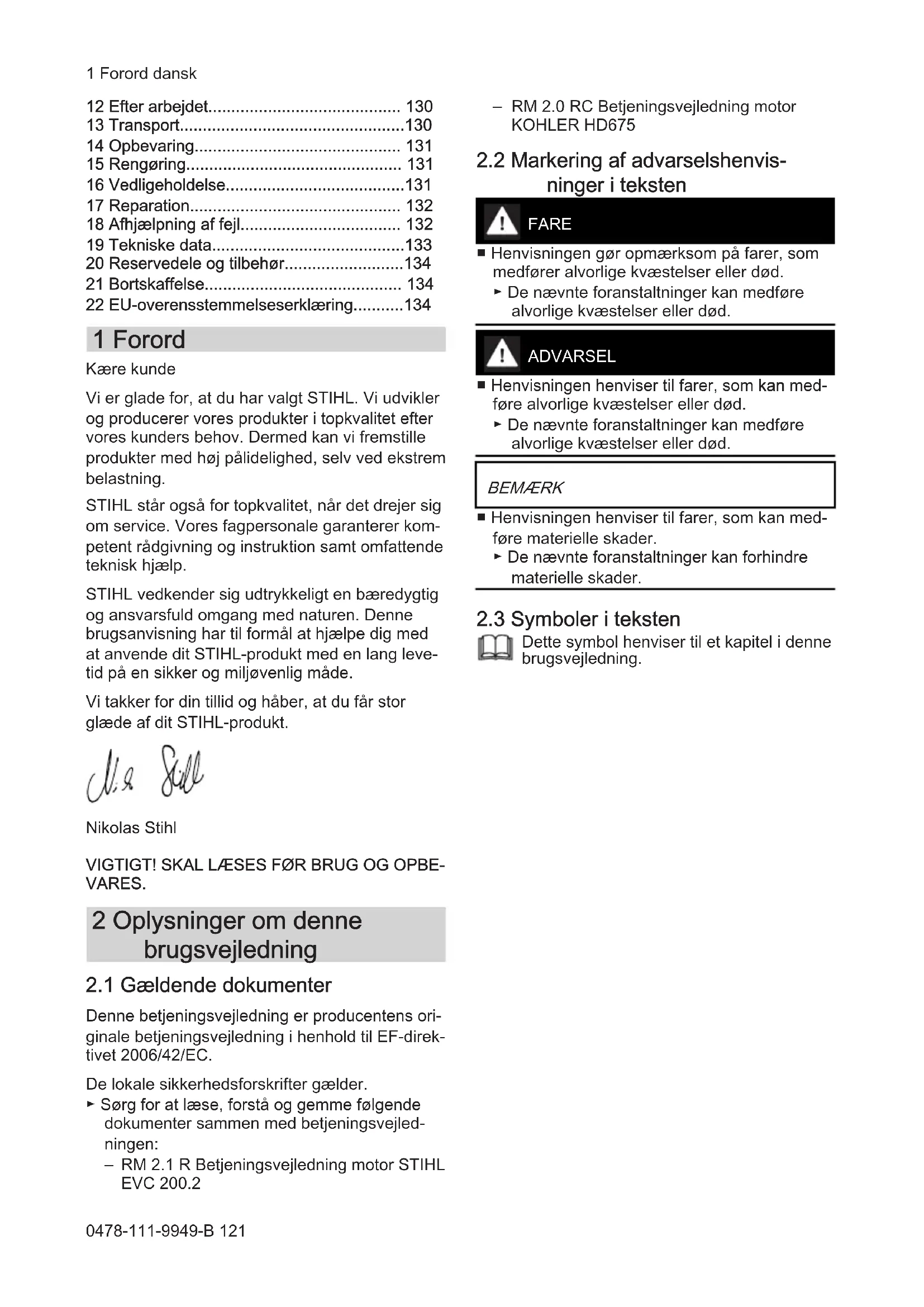 - 22 EU-overensstemmelseserklæring 1 Forord Kære kunde Vi er glade for, at du har valgt STIHL. Vi udvikler og producerer vores produkter i topkvalitet efter vores kunders behov. Dermed kan vi fremstille produkter med høj pålidelighed, selv ved ekstrem belastning. STIHL står også for topkvalitet, når det drejer sig om service. Vores fagpersonale garanterer kom‐ petent rådgivning og instruktion samt omfattende teknisk hjælp. STIHL vedkender sig udtrykkeligt en bæredygtig og ansvarsfuld omgang med naturen. Denne brugsanvisning har til formål at hjælpe dig med at anvende dit STIHL-produkt med en lang leve‐ tid på en sikker og miljøvenlig måde. Vi takker for din tillid og håber, at du får stor glæde af dit STIHL-produkt. Nikolas Stihl VIGTIGT! SKAL LÆSES FØR BRUG OG OPBE‐ VARES. 2 Oplysninger om denne brugsvejledning p. 134
