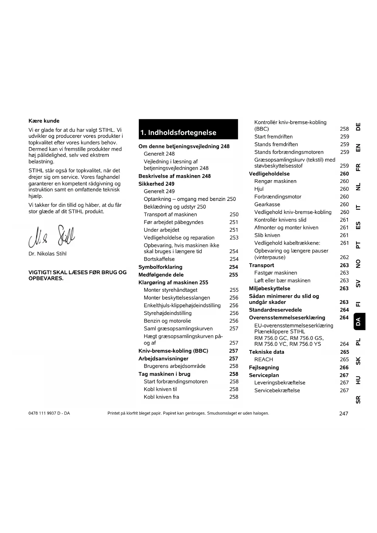 Om denne betjeningsvejledning 248 Generelt 248 Vejledning i læsning af betjeningsvejledningen 248 Beskrivelse af maskinen 248 Sikkerhed 249 Generelt 249 Optankning – omgang med benzin 250 Beklædning og udstyr 250 Transport af maskinen 250 Før arbejdet påbegyndes 251 Under arbejdet 251 Vedligeholdelse og reparation 253 Opbevaring, hvis maskinen ikke skal bruges i længere tid 254 Bortskaffelse 254 Symbolforklaring 254 Medfølgende dele 255 Klargøring af maskinen 255 Monter styrehåndtaget 255 Monter beskyttelsesslangen 256 Enkelthjuls-klippehøjdeindstilling 256 Styrehøjdeindstilling 256 Benzin og motorolie 256 Saml græsopsamlingskurven 257 Hægt græsopsamlingskurven på- og af 257 Kniv-bremse-kobling (BBC) 257 Arbejdsanvisninger 257 Brugerens arbejdsområde 258 Tag maskinen i brug 258 Start forbrændingsmotoren 258 Kobl kniven til 258 Kobl kniven fra 258 Kontrollér kniv-bremse-kobling (BBC) 258 Start fremdriften 259 Stands fremdriften 259 Stands forbrændingsmotoren 259 Græsopsamlingskurv (tekstil) med støvbeskyttelsesstof 259 Vedligeholdelse 260 Rengør maskinen 260 Hjul 260 Forbrændingsmotor 260 Gearkasse 260 Vedligehold kniv-bremse-kobling 260 Kontrollér knivens slid 261 Afmonter og monter kniven 261 Slib kniven 261 Vedligehold kabeltrækkene: 261 Opbevaring og længere pauser (vinterpause) 262 Transport 263 Fastgør maskinen 263 Løft eller bær maskinen 263 Miljøbeskyttelse 263 Sådan minimerer du slid og undgår skader 263 Standardreservedele 264 Overensstemmelseserklæring 264 EU-overensstemmelseserklæring Plæneklippere STIHL RM 756.0 GC, RM 756.0 GS, RM 756.0 YC, RM 756.0 YS 264 Tekniske data 265 REACH 265 Fejlsøgning 266 Serviceplan 267 Leveringsbekræftelse 267 Servicebekræftelse 2670478 111 9937 D - DA