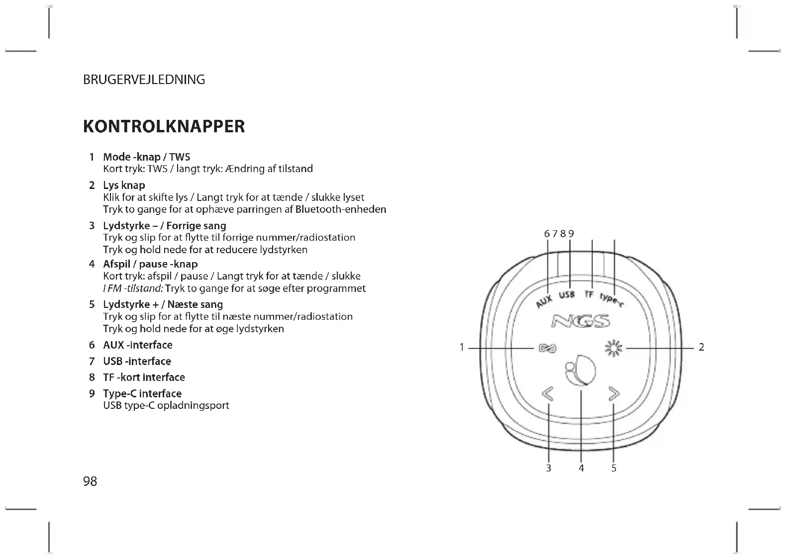 Mode -knap / TWS Kort tryk: TWS / langt tryk: Ændring af tilstand Lys knap Klik for at skifte lys / Langt tryk for at tænde / slukke lyset Tryk to gange for at ophæve parringen af Bluetooth-enheden Lydstyrke – / Forrige sang Tryk og slip for at ytte til forrige nummer/radiostation Tryk og hold nede for at reducere lydstyrken Afspil / pause -knap Kort tryk: afspil / pause / Langt tryk for at tænde / slukke I FM -tilstand: Tryk to gange for at søge efter programmet Lydstyrke + / Næste sang Tryk og slip for at ytte til næste nummer/radiostation Tryk og hold nede for at øge lydstyrken AUX -interface USB -interface TF -kort interface Type-C interface USB type-C opladningsport