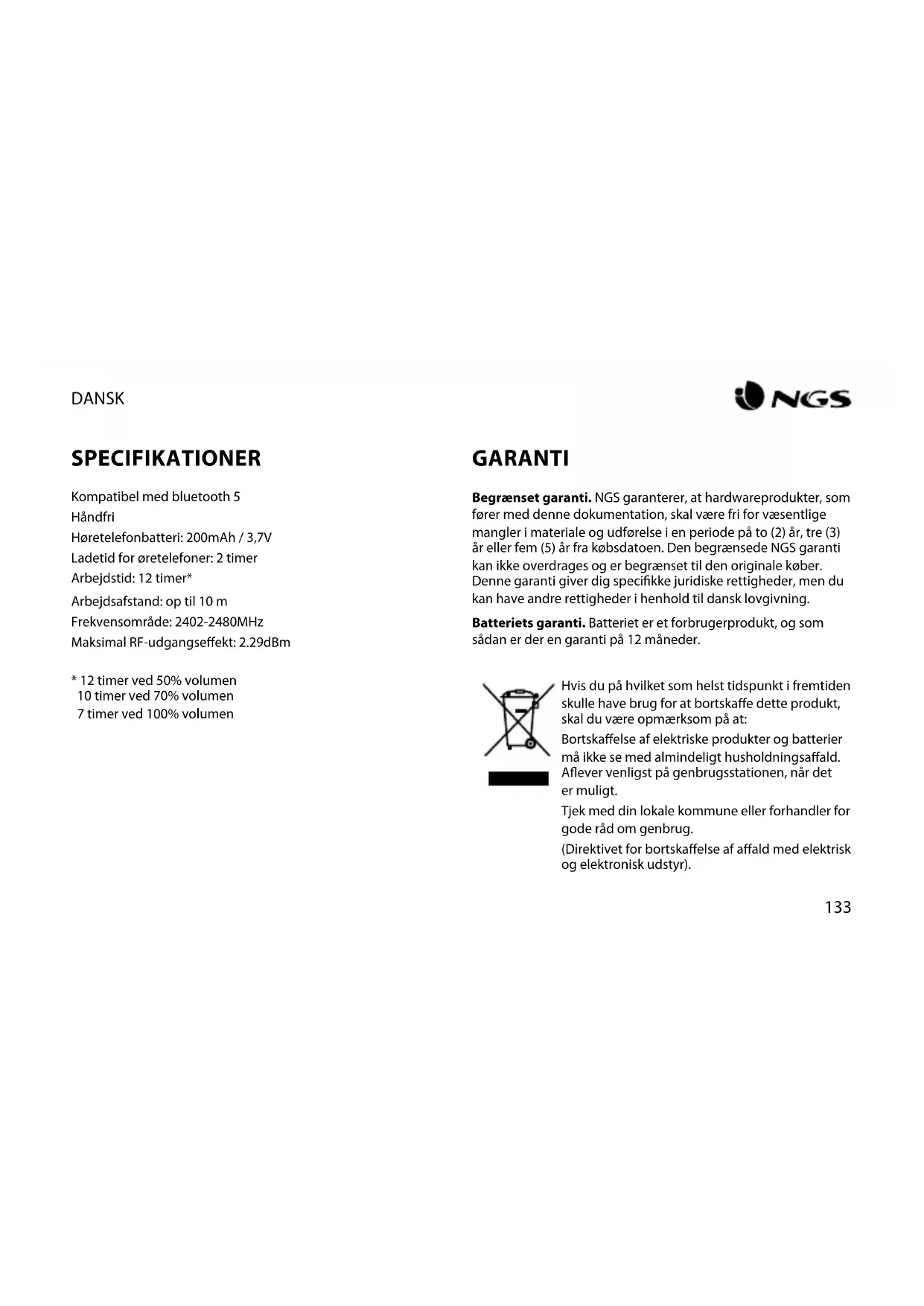SPECIFIKATIONER Hvis du på hvilket som helst tidspunkt i fremtiden skulle have brug for at bortskae dette produkt, skal du være opmærksom på at: Bortskaelse af elektriske produkter og batterier må ikke se med almindeligt husholdningsaald. Aever venligst på genbrugsstationen, når det er muligt. Tjek med din lokale kommune eller forhandler for gode råd om genbrug. (Direktivet for bortskaelse af aald med elektrisk og elektronisk udstyr). GARANTI Begrænset garanti. NGS garanterer, at hardwareprodukter, som fører med denne dokumentation, skal være fri for væsentlige mangler i materiale og udførelse i en periode på to (2) år, tre (3) år eller fem (5) år fra købsdatoen. Den begrænsede NGS garanti kan ikke overdrages og er begrænset til den originale køber. Denne garanti giver dig specikke juridiske rettigheder, men du kan have andre rettigheder i henhold til dansk lovgivning. Batteriets garanti. Batteriet er et forbrugerprodukt, og som sådan er der en garanti på 12 måneder. Kompatibel med bluetooth 5 Håndfri Høretelefonbatteri: 200mAh / 3,7V Ladetid for øretelefoner: 2 timer Arbejdstid: 12 timer* Arbejdsafstand: op til 10 m Frekvensområde: 2402-2480MHz Maksimal RF-udgangseekt: 2.29dBm