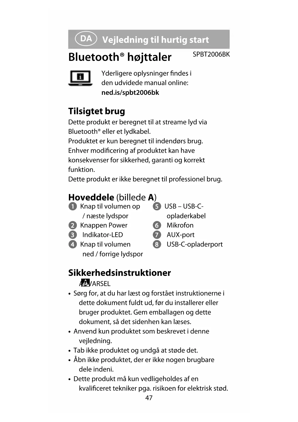 Vejledning til hurtig start Bluetooth® højttaler SPBT2006BKYderligere oplysninger ndes i den udvidede manual online: ned.is/spbt2006bk Tilsigtet brug Dette produkt er beregnet til at streame lyd via Bluetooth® eller et lydkabel.Produktet er kun beregnet til indendørs brug.Enhver modicering af produktet kan have konsekvenser for sikkerhed, garanti og korrekt funktion.Dette produkt er ikke beregnet til professionel brug. Hoveddele (billede A) 1 Knap til volumen op / næste lydspor 2 Knappen Power 3 Indikator-LED 4 Knap til volumen ned / forrige lydspor 5 USB – USB-C- opladerkabel 6 Mikrofon 7 AUX-port 8 USB-C-opladerport Sikkerhedsinstruktioner