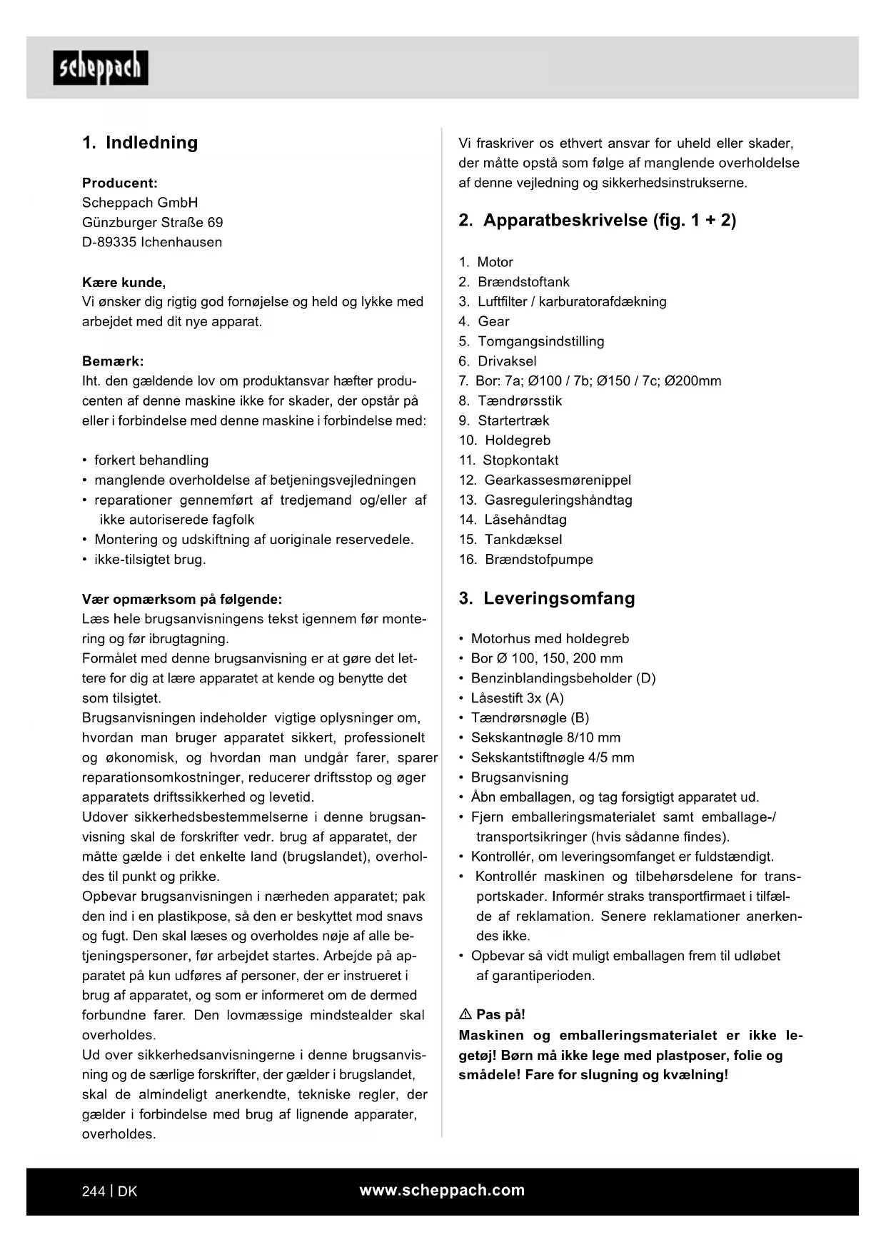 Producent: Scheppach GmbH Günzburger Straße 69 D-89335 Ichenhausen Kære kunde, Vi ønsker dig rigtig god fornøjelse og held og lykke med arbejdet med dit nye apparat. Bemærk: Iht. den gældende lov om produktansvar hæfter produ- centen af denne maskine ikke for skader, der opstår på eller i forbindelse med denne maskine i forbindelse med:
