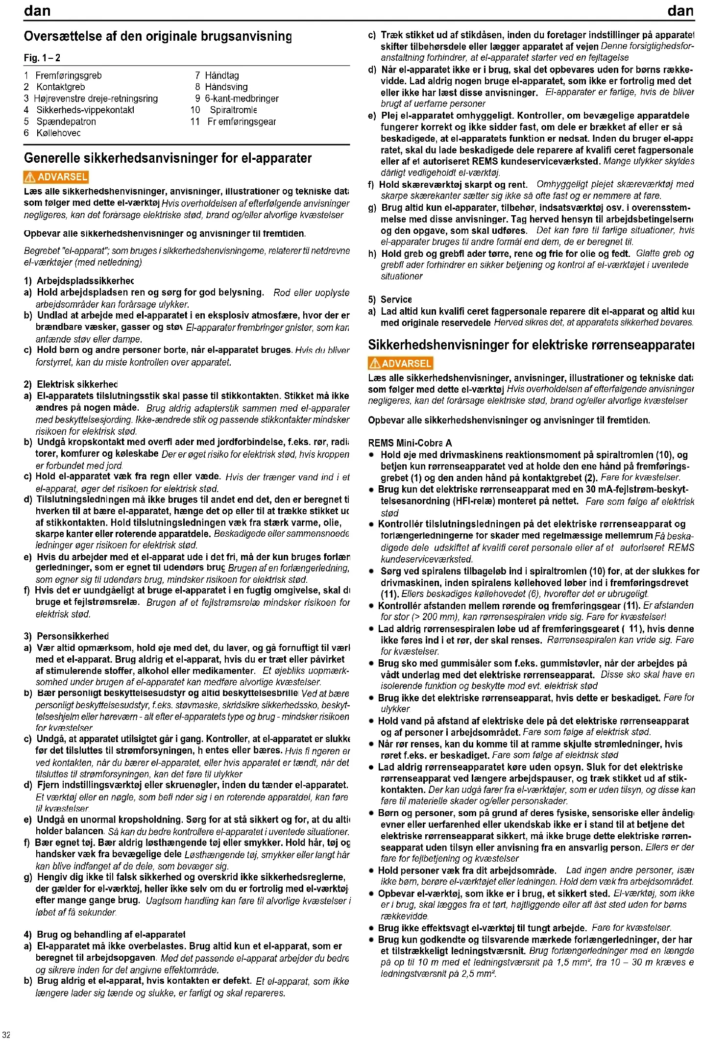Læs alle sikkerhedshenvisninger, anvisninger, illustrationer og tekniske data, som følger med dette el-værktøj. Hvis overholdelsen af efterfølgende anvisninger negligeres, kan det forårsage elektriske stød, brand og/eller alvorlige kvæstelser. Opbevar alle sikkerhedshenvisninger og anvisninger til fremtiden. REMS Mini-Cobra