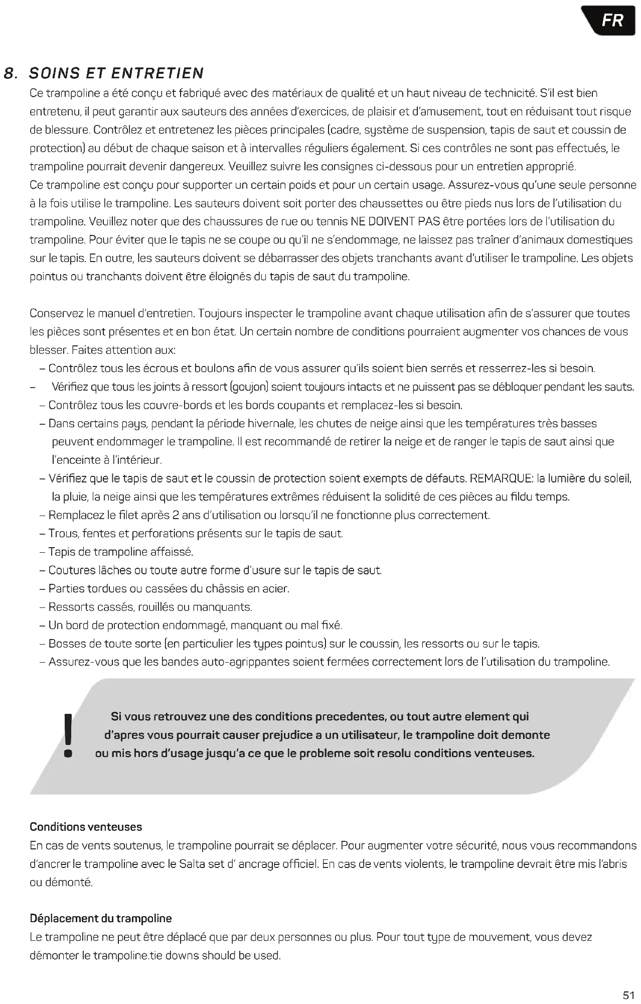 Trampolinen er designet med omhu og fremstillet i kvalitetsmaterialer. Korrekt pleje og vedligeholdelse forlænger trampolinens levetid og reducerer risikoen for personskade. Kontroller trampolinens primære dele (stel, affjedringssystem, måtte og skumbeskyttelse) både løbende og i starten af hver sæson. Følg op med den nødvendige pleje og vedligeholdelse. Hvis disse kontroleftersyn ikke gennemføres, kan trampolinen komme til at udgøre en sikkerhedsrisiko. Følg disse retningslinjer: Trampolinen er designet til en bestemt vægt og anvendelse. Trampolinen må kun bruges af én person ad gangen. Vær barfodet eller brug strømper, når du bruger trampolinen. Brug IKKE sko, sportssko eller andet fodtøj! Hold husdyr væk fra trampolinen for at beskytte trampolindugen mod revner eller skader. Fjern skarpe eller hårde genstande fra lommerne, inden du bruger trampolinen. Hold altid skarpe eller spidse genstande væk fra måtten. Behold disse instruktioner til senere brug. Efterse altid trampolinen før brug, og vær især opmærksom på slidte, beskadigede eller manglende dele. Forskellige forhold øger risikoen for, at brugeren kan komme til skade. Vær især opmærksom på: – Tjek at alle møtrikker og bolte sidder stramt og sikkert. Stram efter ved behov. – Tjek at alle fjederbelastede led (pit pins) er intakte og ikke kan komme til at forskubbe sig under brug af trampolinen. – Tjek at alle skarpe hjørner er forsvarligt dækket til med skumbeskyttelse, udskift om nødvendigt. – I lande med hårde vintre kan store snemængder og meget lave temperaturer ødelægge trampolinen. Det anbefales at skovle sneen væk og opbevare måtten og nettet indenfor. – Tjek at måtten og skumbeskyttelsen ikke har taget skade; BEMÆRK at sol, regn, sne og ekstreme temperaturer svækker disse dele over tid. – Udskift nettet efter 2 års brug eller når det ikke længere fungerer korrekt. – Huller, revner eller rifter i måtten. – At måtten ikke “hænger” midt på. – Løse syninger og mørning af måtten. – Bøjede eller brækkede steldele, f.eks. ben. – Manglende, knækkede eller beskadigede fjedre. – Manglende, beskadiget eller ikke-fastgjort kantpude. – Dele på rammen, fjedre eller fjedermåtte, der stikker ud. – Sørg for at alle lukninger med velcrobånd er lukket korrekt under brug af trampolinen. Blæst I kraftig blæst kan trampolinen blive blæst omkring. For at øge sikkerheden anbefaler vi at bruge det officielle Salta Stormankre Set. Hvis der er udsigt til kraftig blæst, skal du flytte trampolin en til et område med læ eller adskilles. Flytning af trampolinen Der skal bruges to personer til at flytte trampolinen. Flyt trampolinen ved at løfte den en anelse fra jorden og holde den vandret. Hvis trampolinen skal flyttes på anden måde, skal den adskilles. Hvis der er tegn på skade eller forhold, der kan skade brugeren, skal trampolinen adskilles eller afspærres, så den før fejlen er udbedret.