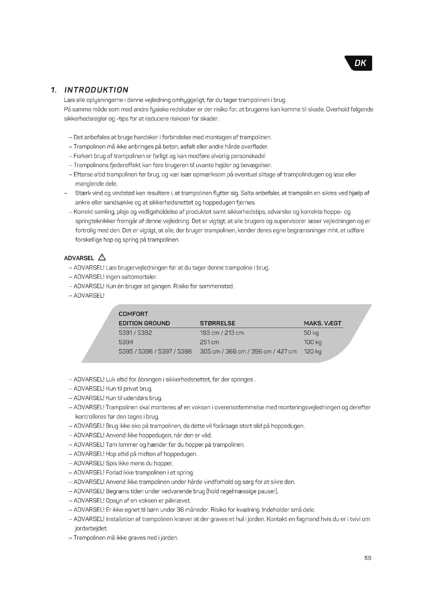 Adgang til trampolinen: Det er vigtigt, at du er meget forsigtig, når du klatrer op på trampolinen og ned fra den. DET ER IKKE TILLADT at klatre op på trampolinen ved at tage fat i kantpuden eller ved at træde på fjedrene eller ved at hoppe op på den fra en tilstødende genstand (f.eks. en terrasse, et tag eller en stige). Dette øger risikoen for skader! DET ER IKKE TILLADT at hoppe ned fra trampolinen, uanset hvad trampolinens underlag er lavet af. Mindre børn, som bruger trampolinen, har muligvis brug for hjælp til at komme op og ned fra trampolinen. Brug af alkohol og medicin: DET ER IKKE TILLADT at indtage alkohol eller medicin under brugen af trampolinen! Indtagelse af alkohol eller medicin svækker din dømmekraft, reaktionstid og koordinationsevne og øger dermed risikoen for skader. Nedslag på fjederrammen: Hop altid MIDT på trampolindugen. Det reducerer risikoen for skader ved nedslag på rammen eller fjedrene. Sørg altid for, at trampolinens kant er dækket af kantpuden. DET ER IKKE TILLADT at hoppe eller træde direkte på kantpuden, da den ikke er konstrueret til at kunne bære en persons vægt. Manglende kontrol: PRØV IKKE vanskelige manøvrer eller andre manøvrer, før du mestrer den forudgående manøvre, eller hvis du er i gang med at lære at hoppe på en trampolin. Ellers er der større risiko for, at du mister kontrollen med dit spring og kommer til skade, f.eks. hvis du lander på rammen eller fjedrene eller hopper helt ned af trampolinen. Et kontrolleret spring er et spring, hvor nedslaget er på det samme sted som afsættet. Hvis du mister kontrollen, mens du hopper på trampolinen, skal du bøje skarpt i knæene, når du lander, så du kan genvinde kontrollen og afbryde springet. Saltomortaler (koldbøtter): DER MÅ ALDRIG laves saltomortaler eller koldbøtter (hverken forlæns eller baglæns) på denne trampolin. Hvis du laver en fejl, når du forsøger at slå en saltomortale eller koldbøtte, er der risiko for, at du lander på hovedet eller nakken. Det øger risikoen for nakke- eller rygskader, som i værste fald kan medføre lammelse eller død. Fremmedlegemer: Trampolinen MÅ IKKE anvendes hvis der er kæledyr/dyr, mennesker eller andre genstande under eller på trampolinen. Dette øger risikoen for ulykker. Du MÅ IKKE holde noget i hånden når du hopper. Du MÅ IKKE anbringe genstande på trampolinen når den er i brug. Hold øje med luftrummet over trampolinen når du bruger den. Grene, kabler eller andre genstande oven over trampolinen kan føre til ulykker. Dårlig vedligeholdelse af trampolin: En trampolin i dårlig stand øger risikoen for kvæstelser. Trampolinen skal kontrolleres inden brug for bøjede stålrør, revnet dug, løse eller ødelagte fjedre og den generelle stabilitet af trampolinen. Vejrbetingelser: Hold øje med vejret når du bruger trampolinen. Lad være med at bruge trampolinen hvis den er våd, da du kan glide og komme til skade. Hvis det blæser meget kan du miste kontrollen. Begræns adgangen til trampolinen: Når trampolinen ikke er i brug skal stigen opbevares et sikkert sted. Det forhindrer børn i at lege på trampolinen uden opsyn. TIPS TIL AT REDUCERE RISIKOEN FOR ULYKKER Brugerens rolle i at forebygge ulykker Det vigtigste er, at brugeren er i stand til at kontrollere sine spring. Kast dig IKKE ud i vanskeligere og mere komplicerede manøvrer, før du mestrer de grundlæggende springteknikker. Springundervisning er også meget vigtigt af hensyn til sikkerheden. Det er vigtigt, at du læser, forstår og er fortrolig med alle sikkerhedsforskrifter og advarsler, før du bruger trampolinen. Et kontrolleret spring er et spring, hvor nedslaget er på det samme sted som afsættet. Kontakt en uddannet trampolininstruktør for at få flere sikkerhedstips og -anvisninger.62