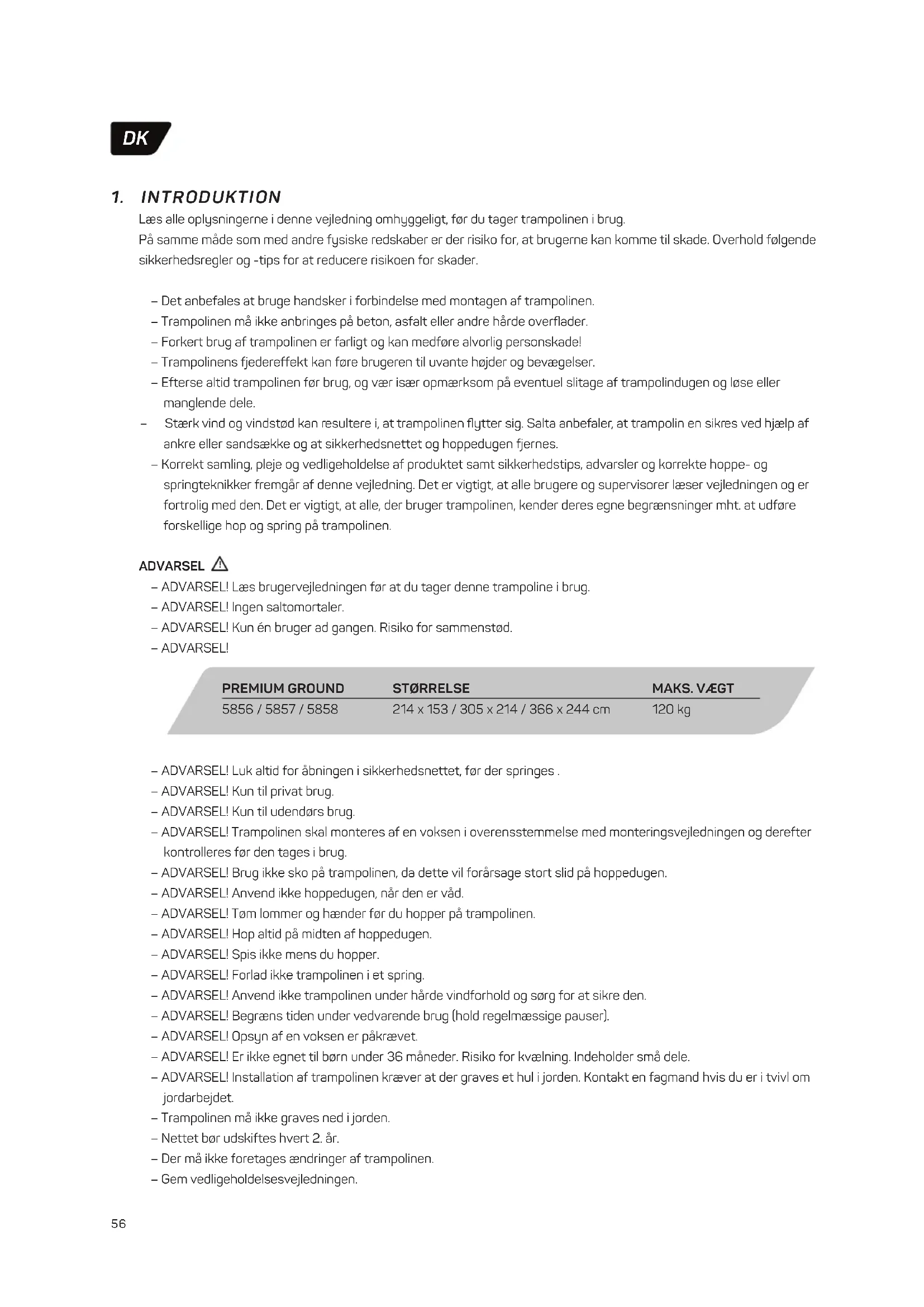 – ADVARSEL! Luk altid for åbningen i sikkerhedsnettet, før der springes . – ADVARSEL! Kun til privat brug. – ADVARSEL! Kun til udendørs brug. – ADVARSEL! Trampolinen skal monteres af en voksen i overensstemmelse med monteringsvejledningen og derefter kontrolleres før den tages i brug. – ADVARSEL! Brug ikke sko på trampolinen, da dette vil forårsage stort slid på hoppedugen. – ADVARSEL! Anvend ikke hoppedugen, når den er våd. – ADVARSEL! Tøm lommer og hænder før du hopper på trampolinen. – ADVARSEL! Hop altid på midten af hoppedugen. – ADVARSEL! Spis ikke mens du hopper. – ADVARSEL! Forlad ikke trampolinen i et spring. – ADVARSEL! Anvend ikke trampolinen under hårde vindforhold og sørg for at sikre den. – ADVARSEL! Begræns tiden under vedvarende brug (hold regelmæssige pauser). – ADVARSEL! Opsyn af en voksen er påkrævet. – ADVARSEL! Er ikke egnet til børn under 36 måneder. Risiko for kvælning. Indeholder små dele. – ADVARSEL! Installation af trampolinen kræver at der graves et hul i jorden. Kontakt en fagmand hvis du er i tvivl om jordarbejdet. – Trampolinen må ikke graves ned i jorden. – Nettet bør udskiftes hvert 2. år. – Der må ikke foretages ændringer af trampolinen. – Gem vedligeholdelsesvejledningen.