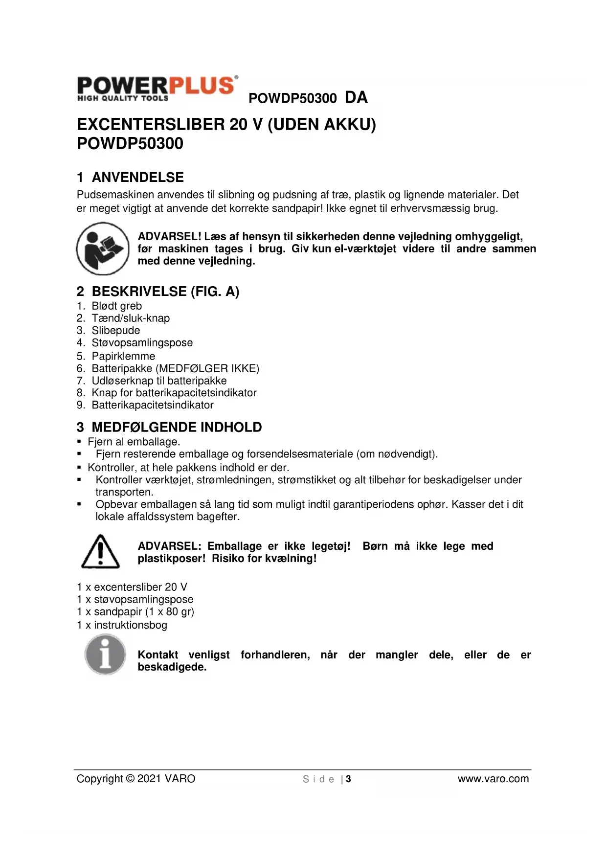 - Opbevar emballagen så lang tid som muligt indtil garantiperiodens ophør. Kasser det i dit lokale affaldssystem bagefter. ADVARSEL: Emballage er ikke legetøj! Børn må ikke lege med plastikposer! Risiko for kvælning! 1 x excentersliber 20 V 1 x støvopsamlingspose 1 x sandpapir (1 x 80 gr) 1 x instruktionsbog Kontakt venligst forhandleren, når der mangler dele, eller de er beskadigede.POWDP50300 DA Copyright © 2021 VARO S i d e | 4 www.varo.com 4 SYMBOLFORKLARING I denne brugervejledning og/eller på maskinen anvendes der følgende piktogrammer: